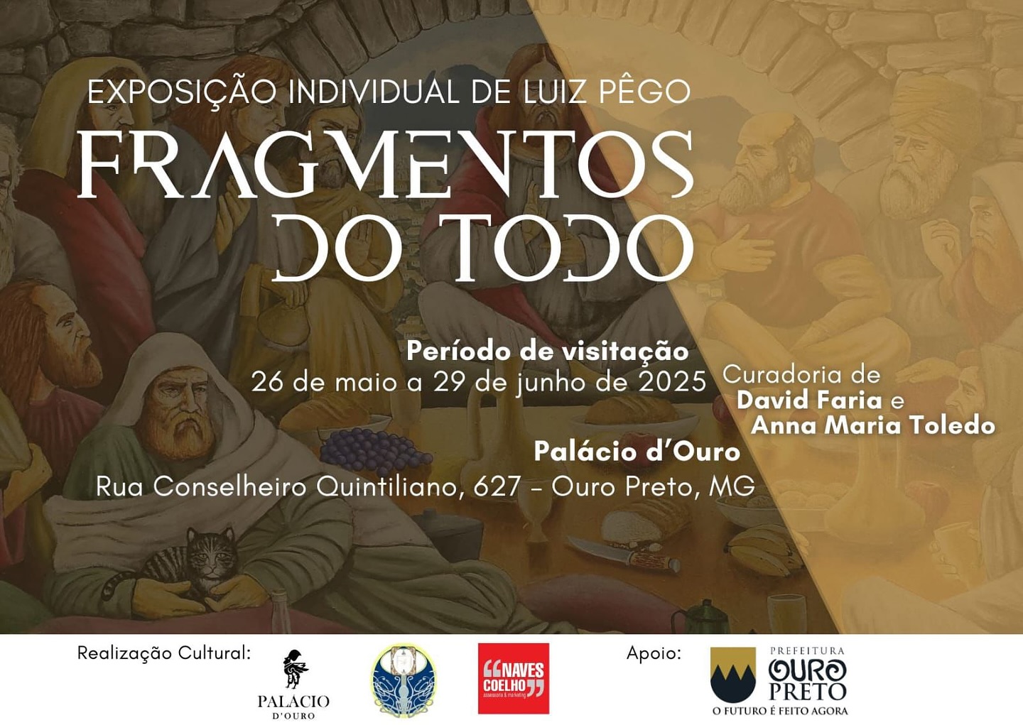 A exposição "Luiz Pêgo – Arte com Sabor Mineiro" estará em cartaz de 26 de maio a 29 de junho, no Palácio d’Ouro, em Ouro Preto, Minas Gerais. A mostra apresenta releituras de obras clássicas de artistas como Frida Kahlo, Leonardo da Vinci, Pablo Picasso e Vincent Van Gogh, reinterpretadas com elementos da cultura mineira.