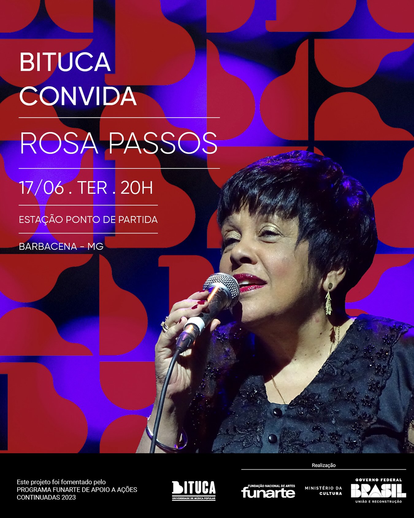Rosa se apresenta acompanhada pelos músicos Lula Galvão (violão), Jorge Hélder (baixo), Celso de Almeida (bateria), Marco Brito (piano) e Lucas Andrade (clarinete). Os ingressos podem ser adquiridos pelo Instagram do Bituca (via DM), pelo telefone (32) 9923-3722, ou pelo Sympla, conforme disponibilidade.
