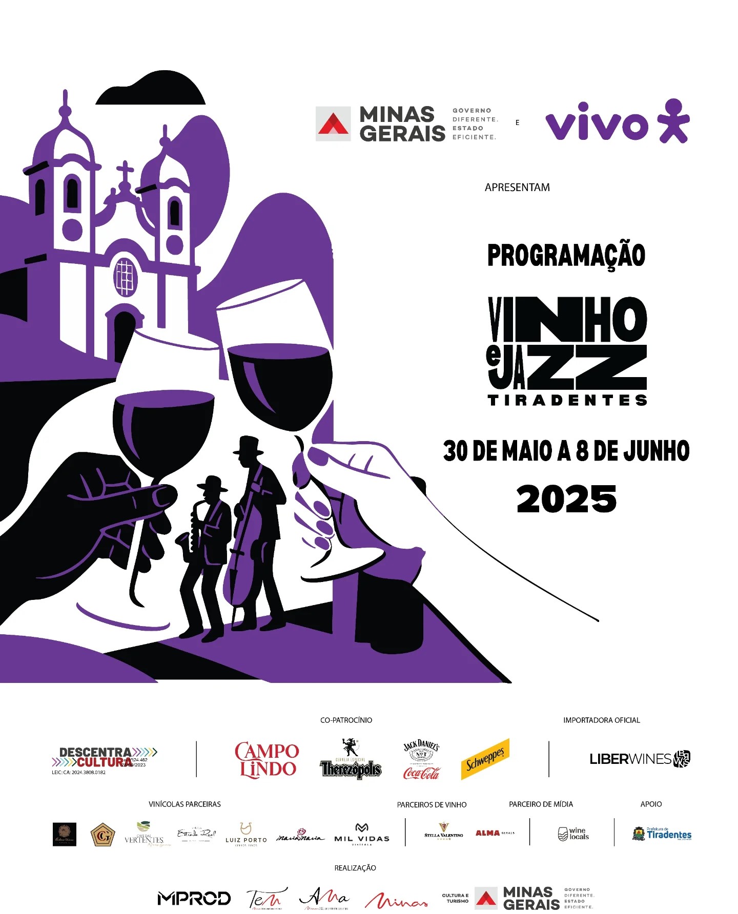 O Festival Vinho e Jazz 2025 acontece de 30 de maio a 8 de junho, na cidade de Tiradentes, Minas Gerais, com programação gratuita na Praça da Rodoviária. O evento reúne shows de jazz, música brasileira e experiências gastronômicas, valorizando produtores locais e vinhos selecionados. Durante o festival, também são oferecidos jantares harmonizados e degustações de vinhos na loja Divinas Gerais e no restaurante Tragaluz, com curadoria da importadora Liber Wines Brasil e dos Queijos Campo Lindo.