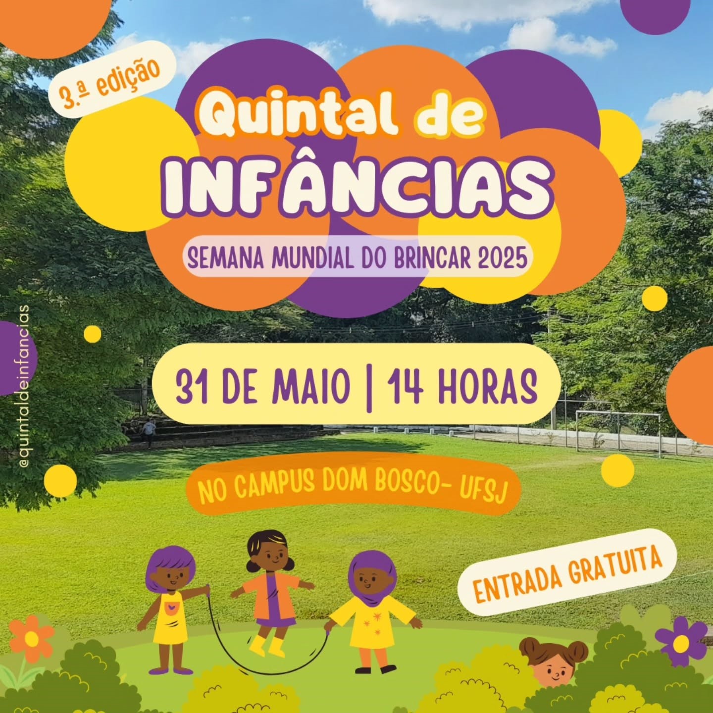O Quintal de Infâncias – 3ª Edição será realizado no dia 31 de maio de 2025, a partir das 14h, no Campus Dom Bosco da UFSJ, em São João del-Rei, como parte da Semana Mundial do Brincar. O evento tem como proposta promover o resgate das brincadeiras populares, oferecendo um espaço livre para interação entre crianças, adultos e famílias, com entrada gratuita e aberta ao público.