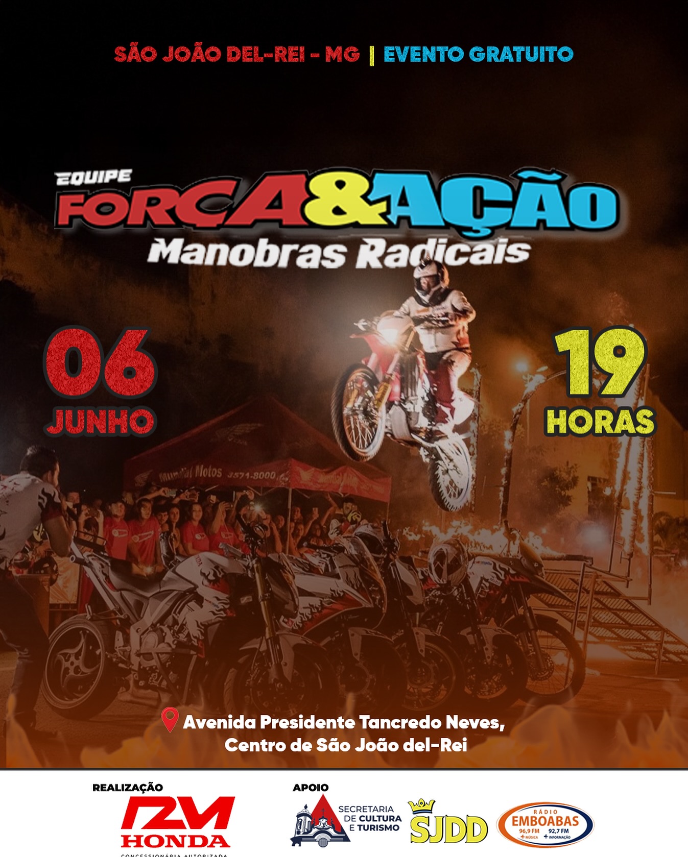 O Show Força e Ação em São João del-Rei acontece na sexta-feira, 6 de junho de 2025, às 19h, na Avenida Presidente Tancredo Neves. O evento traz para a cidade a maior equipe de manobras radicais da América Latina, conhecida por suas apresentações em grandes eventos internacionais e na sede da Honda no Japão.
