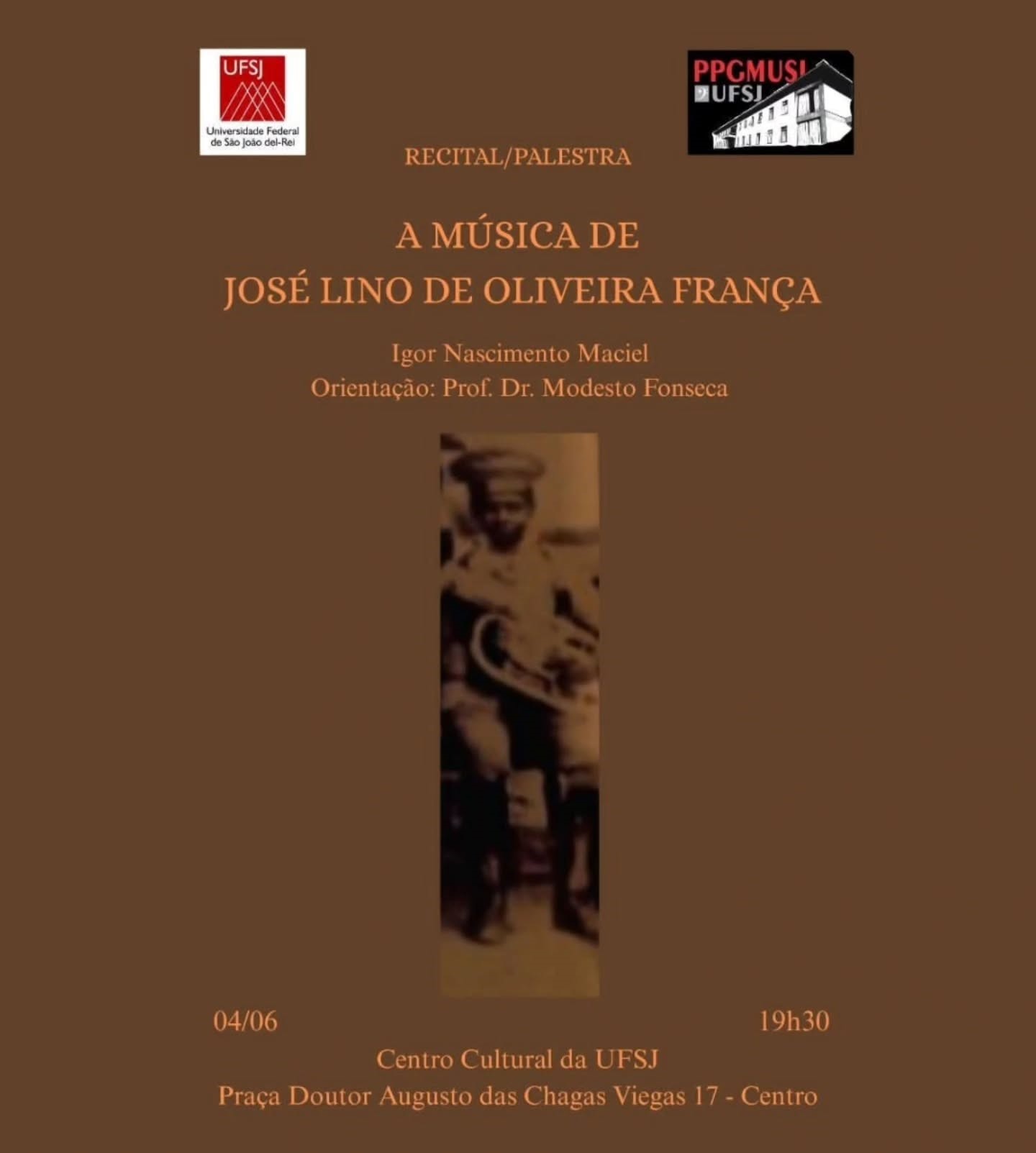 O Recital-Palestra “A Música de José Lino de Oliveira França” será realizado na Universidade Federal de São João del-Rei (UFSJ), com apresentação de Igor Nascimento Maciel, sob orientação do professor Dr. Modesto Fonseca. O evento homenageia o compositor são-joanense José Lino de Oliveira França (1895–1952), que atuou como bombardinista e contramestre da Banda do 11º RI, deixando um legado expressivo na música de banda do século XX.