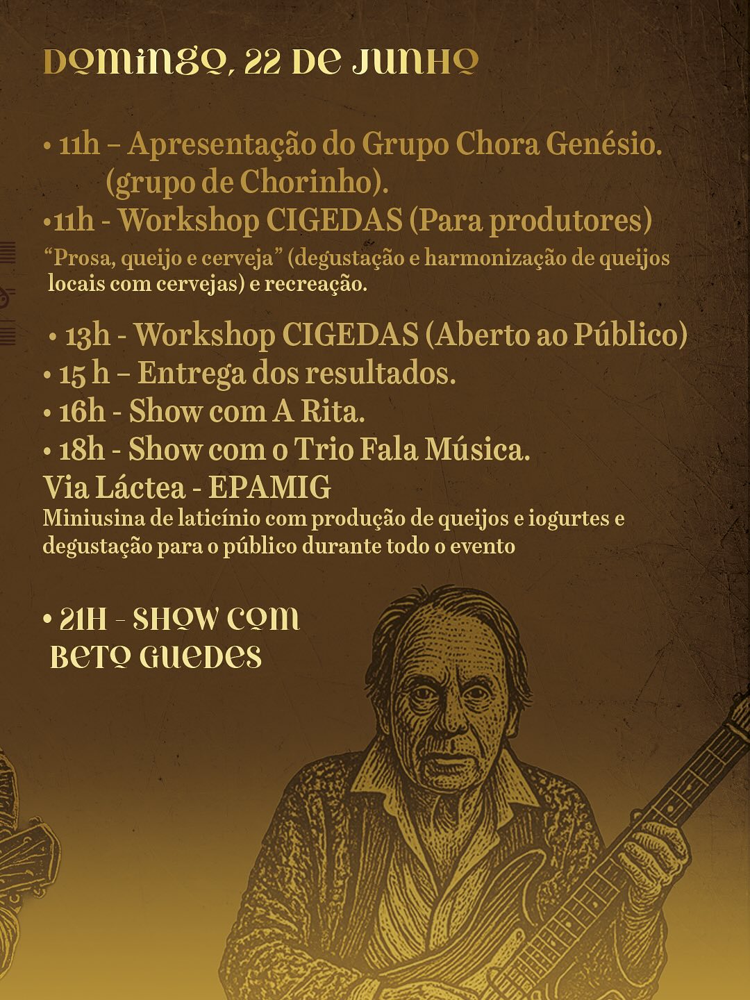 O encerramento do São João dos Queijos 2025 acontece no domingo, 22 de junho, com programação especial no Largo do São Francisco, em São João del-Rei. O dia começa com apresentação do grupo Chora Genésio às 11 horas. Os workshops do CIGEDAS continuam, com foco na harmonização de queijos e cervejas artesanais.