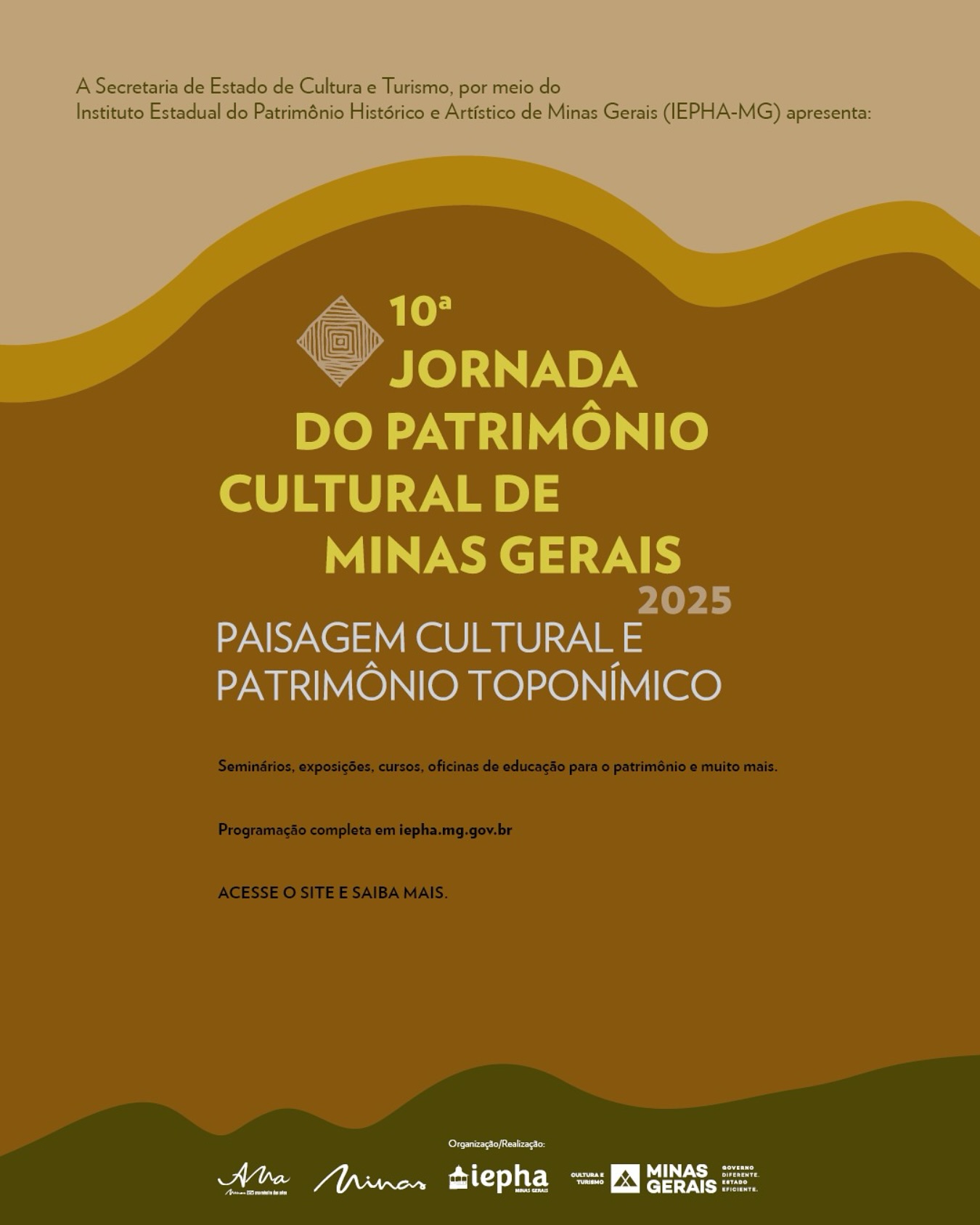 A 10ª Jornada do Patrimônio Cultural de Minas Gerais, promovida pelo IEPHA-MG, tem como tema em 2025 “Paisagem Cultural e Patrimônio Toponímico”. A iniciativa busca incentivar a valorização da história, dos nomes e das memórias que moldam os territórios mineiros, fortalecendo a identidade cultural local.