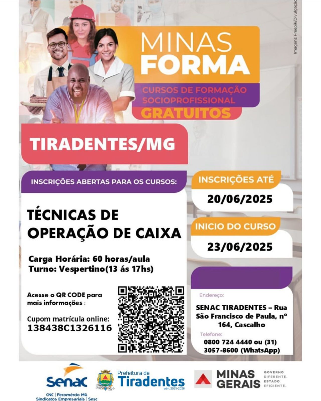 As inscrições estão abertas até o dia 20 de junho de 2025, com início das aulas previsto para 23 de junho de 2025, no horário das 13h às 17h, na unidade do Senac Tiradentes, em Minas Gerais. Informações sobre conteúdo programático, carga horária e processo de inscrição estão disponíveis no site oficial do Senac Minas: www.mg.senac.br.