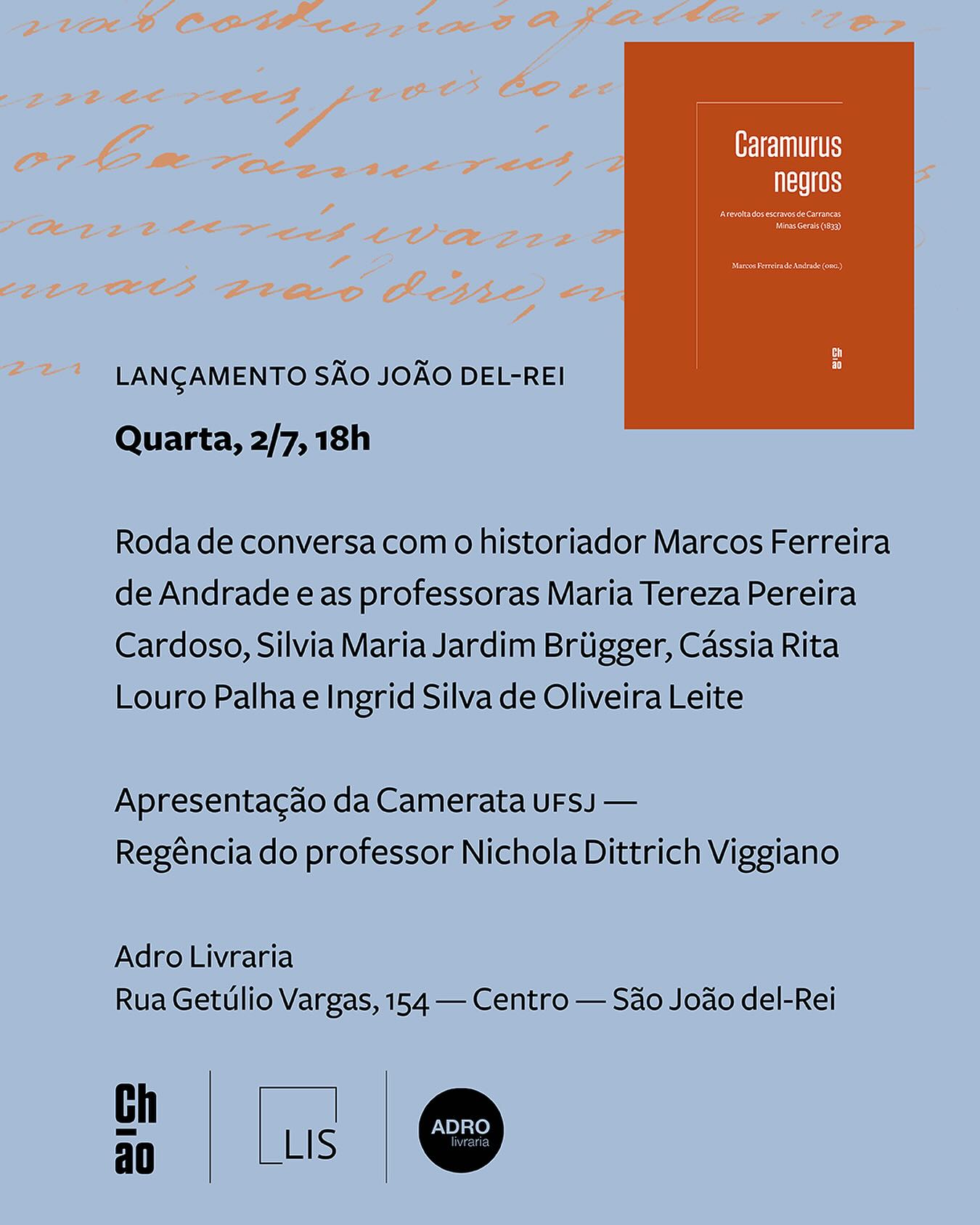 O lançamento do livro “Caramurus negros: a revolta dos escravos de Carrancas — Minas Gerais (1833)”, organizado pelo historiador Marcos Ferreira de Andrade, será realizado no dia 2 de julho de 2025, às 18h, na Adro Livraria, localizada na Rua Getúlio Vargas, 154 – Centro, em São João del-Rei, Minas Gerais. A obra é uma publicação da Chão Editora e aborda um episódio importante da história da resistência negra no Brasil.