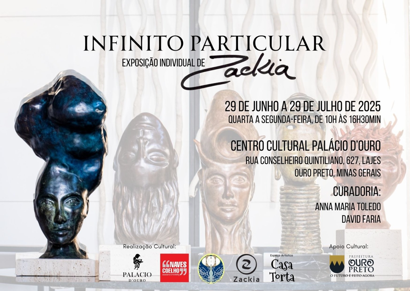 A exposição “Infinito Particular – da série Por Onde Anda a Sua Cabeça?”, da artista Zackia Daura, será inaugurada no dia 29 de junho de 2025, às 10h30, no Palácio D’Ouro, em Ouro Preto, Minas Gerais. A mostra apresenta esculturas em bronze que transformam ditos populares brasileiros em metáforas visuais, convidando o público a uma experiência de pausa, silêncio e reconexão com a própria essência.