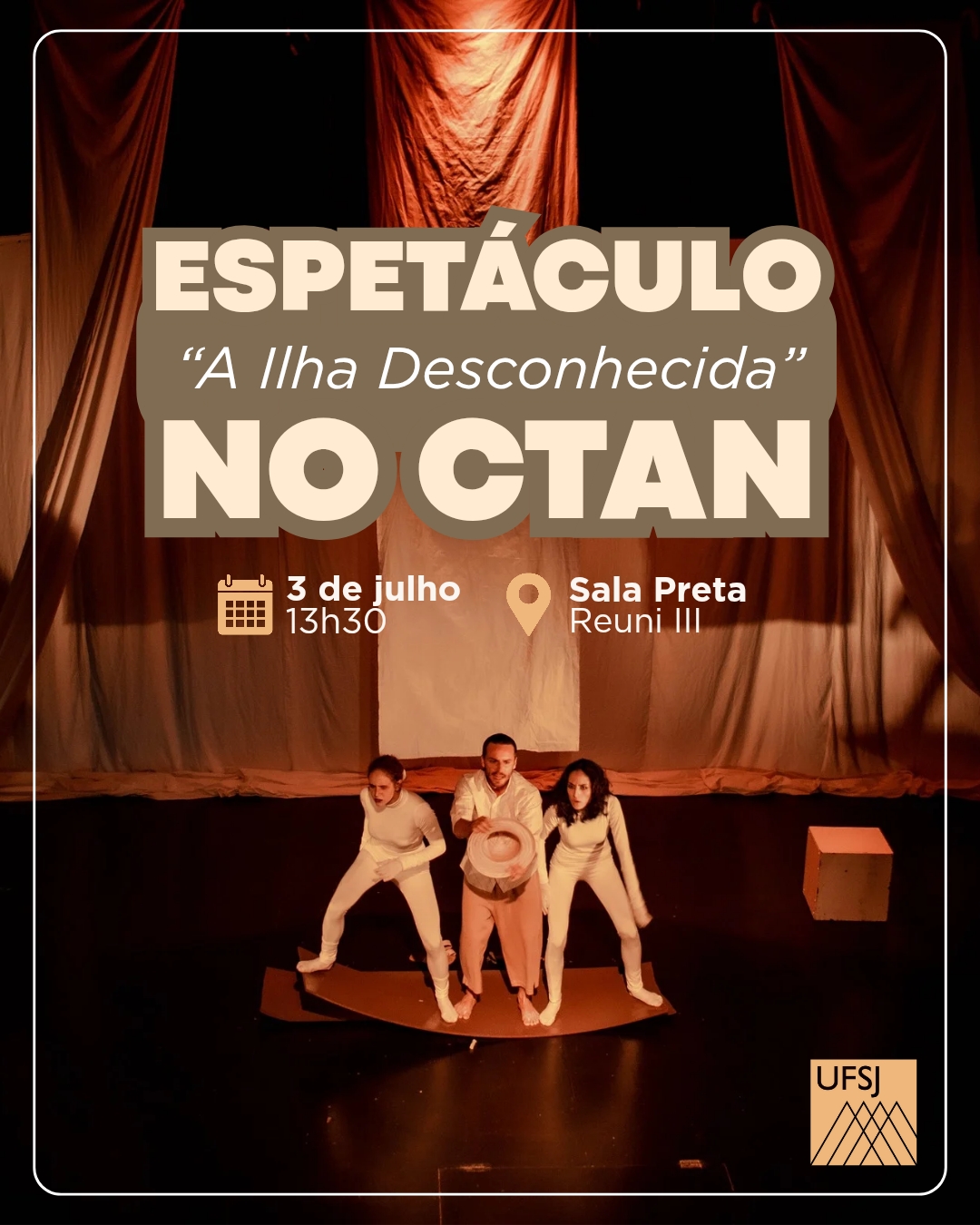 O projeto Saramago no Teatro, realizado pela Futuros Carecas Companhia de Teatro, chega ao fim com a apresentação do espetáculo “A Ilha Desconhecida”, no dia 3 de julho de 2025, às 13h30, na Sala Preta do CTAN, em São João del-Rei (MG). A sessão é gratuita e voltada para estudantes da Escola Estadual Tomé Portes Del Rei e servidores terceirizados da UFSJ, encerrando as atividades do projeto contemplado pela Lei Aldir Blanc.