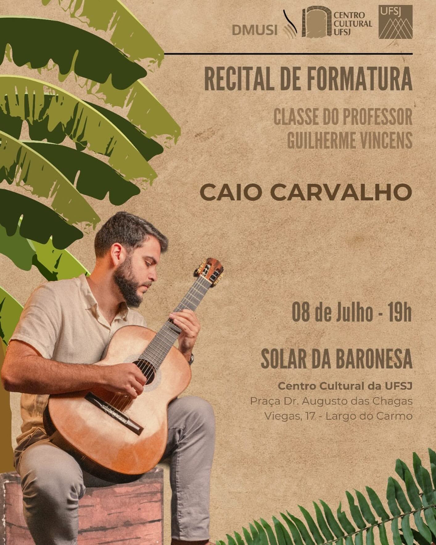 O recital de formatura de Caio Carvalho, aluno da classe de violão do professor Guilherme Vincens, será realizado no dia 8 de julho, às 19h, no Centro Cultural da UFSJ (Solar da Baronesa). O evento marca a conclusão de seus estudos e apresentará um repertório que destaca a expressividade e a técnica no violão, evidenciando a trajetória artística desenvolvida ao longo da graduação.