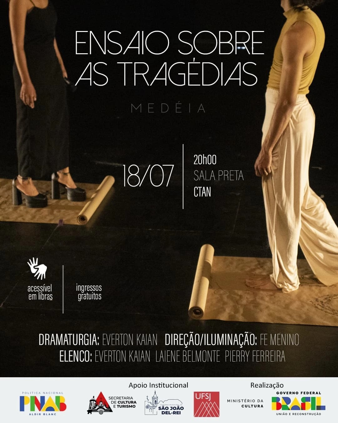 O Coletivo Mandinga realiza duas apresentações gratuitas do espetáculo "Ensaio sobre as Tragédias – Medeia", nos dias 18 e 19 de julho de 2025, em São João del-Rei. A montagem propõe uma releitura contemporânea da tragédia clássica de Eurípedes, explorando camadas sociais, políticas e existenciais em dois locais: na Sala Preta do CTAN/UFSJ, no dia 18, às 20h, e no Salão Comunitário do Senhor dos Montes, no dia 19, às 19h.