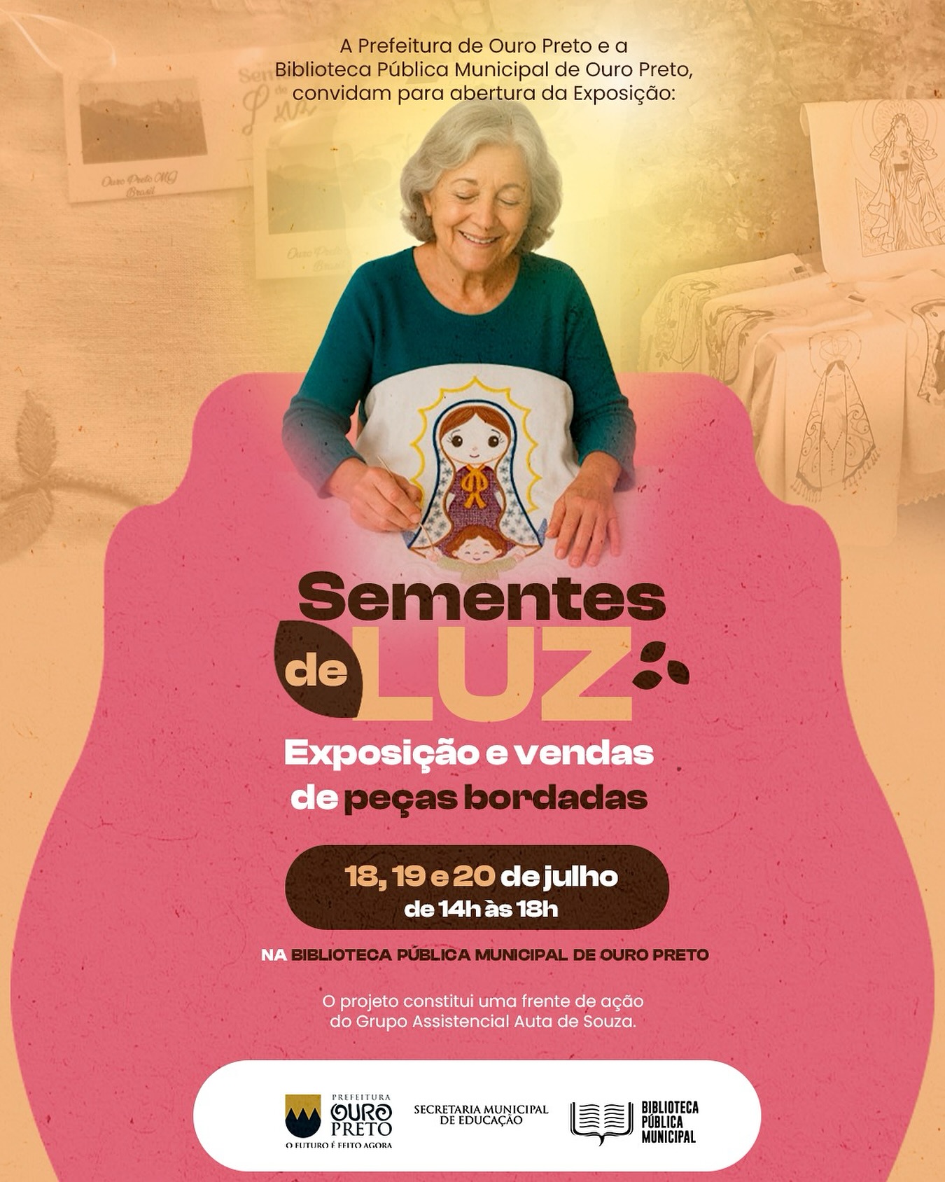 A Exposição e Venda dos Bordados Sementes de Luz será realizada de 18 a 20 de julho de 2025, sempre das 14h às 18h, na Biblioteca Pública Municipal de Ouro Preto. O evento celebra o trabalho artesanal de bordadeiras voluntárias, promovendo o encontro entre tradição, empreendedorismo local e valorização da cultura popular. A entrada é gratuita e aberta ao público.