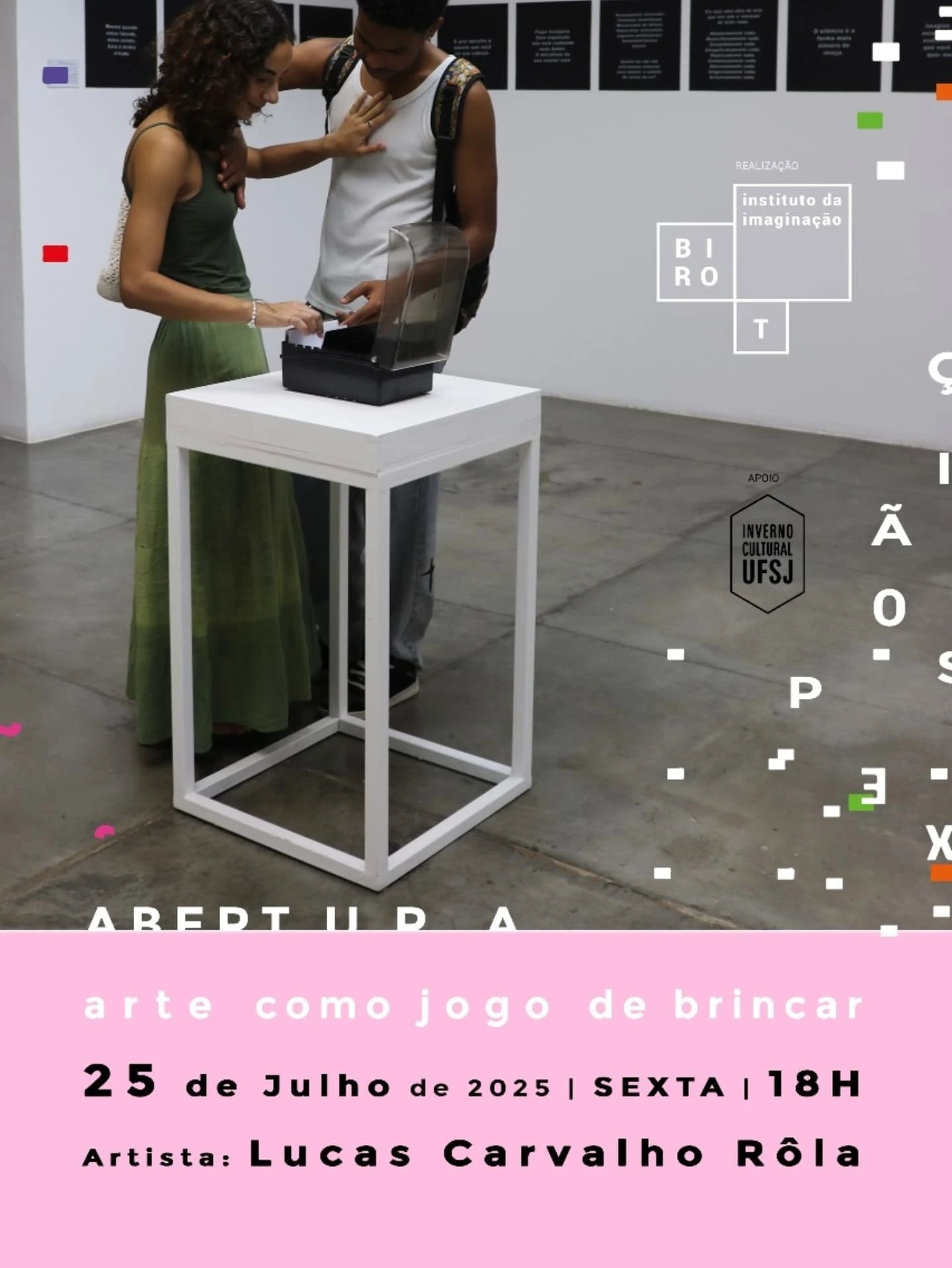 A exposição “Arte como jogo de brincar”, com abertura no dia 25 de julho de 2025, às 18h, integra a programação do Inverno Cultural UFSJ em São João del-Rei. A mostra apresenta obras do artista Lucas Carvalho Rôla e acontece simultaneamente em dois espaços culturais: o Centro Cultural UFSJ – Solar da Baronesa (Praça Doutor Augusto das Chagas Viegas, 17 – Centro) e o espaço BIROT – Instituto da Imaginação (Praça Embaixador Gastão da Cunha, 190A – Centro, atrás da Igreja do Rosário). A classificação indicativa é de 12 anos.