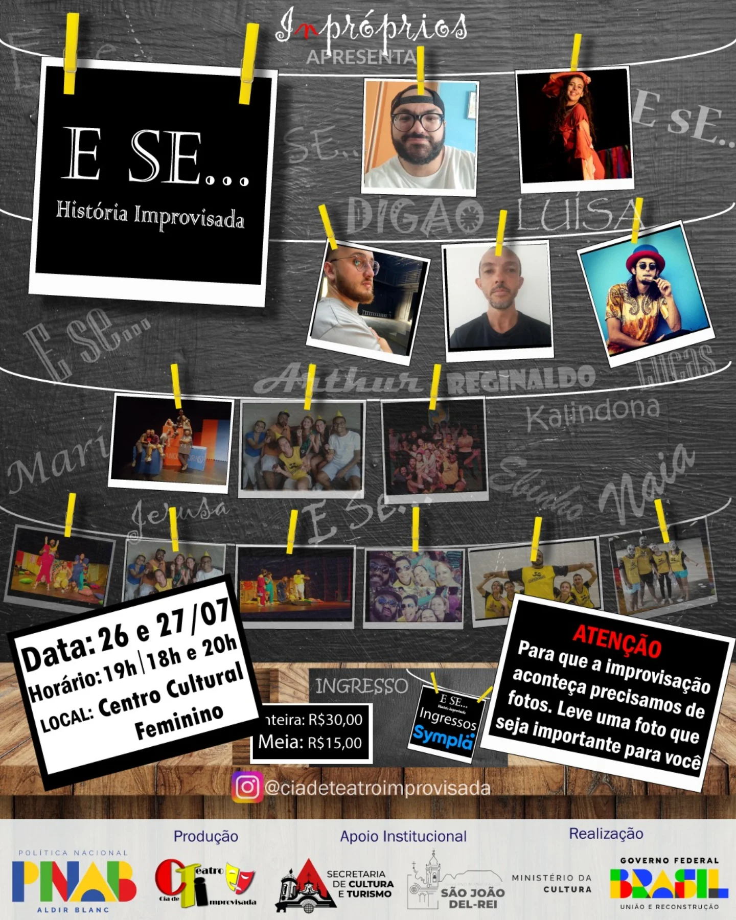 O espetáculo “E se... História Improvisada” terá sua reestreia nos dias 26 e 27 de julho de 2025, no Centro Cultural Feminino, localizado na Rua da Cachaça, em São João del-Rei (MG). A criação é da primeira formação do grupo Inpróprios, parte da CTI – Companhia de Teatro Improvisada. As apresentações ocorrem no dia 26, às 19h, e no dia 27, às 18h e 20h. Os ingressos estarão disponíveis a partir de 1º de julho pela plataforma Sympla: link de venda.