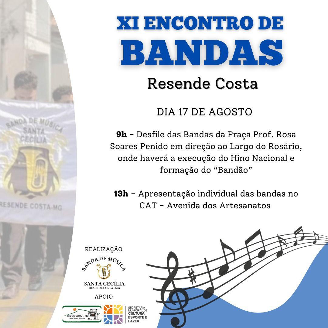 O XI Encontro de Bandas de Resende Costa será realizado no dia 17 de agosto de 2025, no município de Resende Costa (MG). O evento reunirá diversas bandas da região em um dia dedicado à música instrumental e à valorização das corporações musicais tradicionais. A programação inclui um desfile e apresentações individuais ao longo do dia, promovendo o intercâmbio cultural entre os grupos participantes.