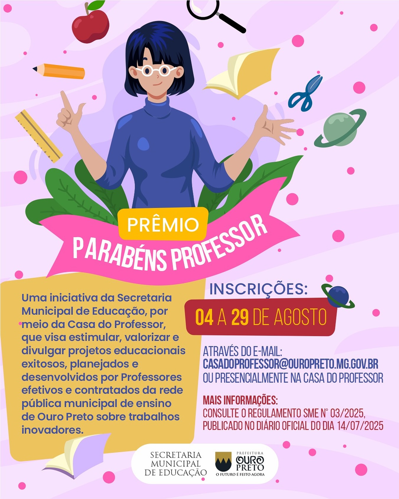 Prêmio Parabéns, Professor! é uma iniciativa da Secretaria Municipal de Educação de Ouro Preto com o objetivo de estimular, valorizar e divulgar projetos educacionais de destaque desenvolvidos por professores efetivos e contratados da rede pública municipal. A premiação reconhece práticas pedagógicas inovadoras que contribuem significativamente para a melhoria da educação no município.