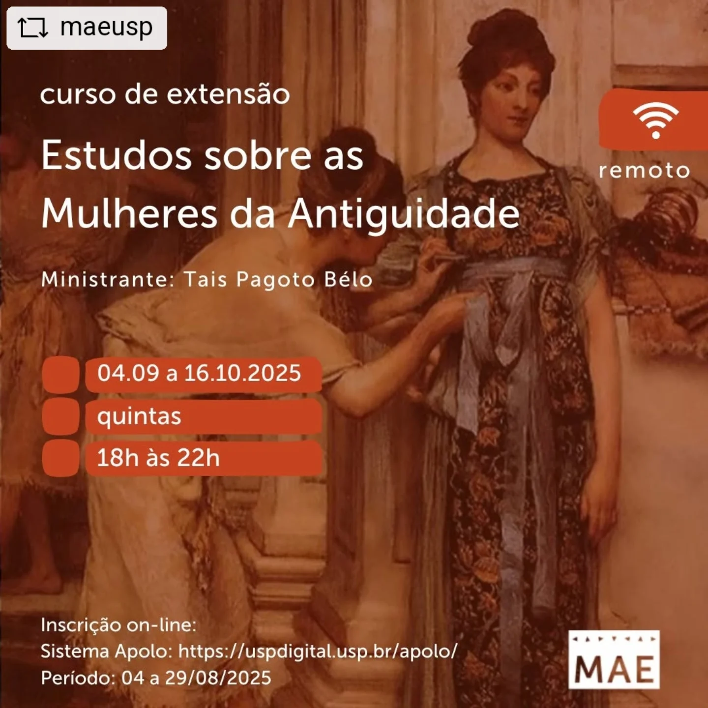 O curso de extensão "Estudos sobre as Mulheres da Antiguidade", promovido pela Universidade de São Paulo (USP) por meio do MAE-USP, será realizado de 4 de setembro a 16 de outubro de 2025, sempre às quintas-feiras, das 18h às 22h, em formato remoto. A formação será ministrada por Tais Pagoto Bélo e busca introduzir noções básicas dos estudos de gênero, com foco na representação e atuação da mulher na História e na Arqueologia.