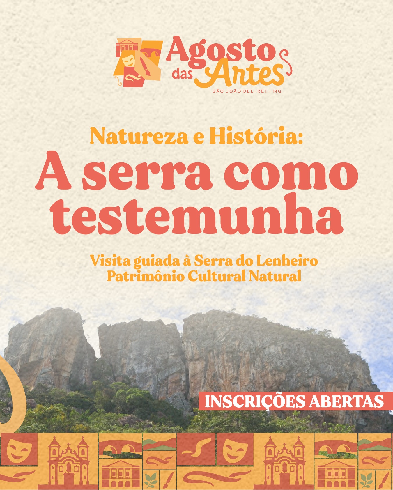 O Agosto das Artes apresenta no dia 31 de agosto de 2025 a atividade “A Serra como Testemunha”, uma visita guiada especial pela Serra do Lenheiro, em São João del-Rei (MG). Reconhecida como um dos mais importantes patrimônios culturais e naturais do município, a Serra preserva registros históricos gravados em pedra e mantém viva a memória coletiva da região.