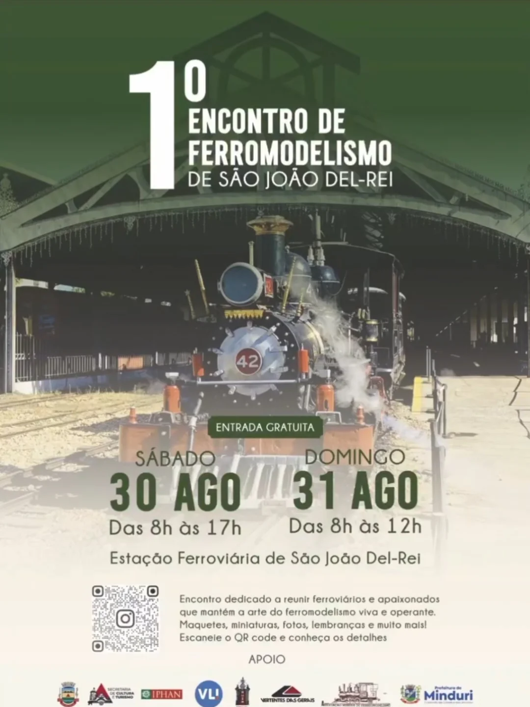 A programação contará com dois dias de atividades. No sábado, 30 de agosto, as exposições e demonstrações acontecem das 8h às 17h, com maquetes, miniaturas e a presença de expositores locais e convidados. No domingo, 31 de agosto, o encontro segue das 8h às 12h, mantendo as atividades expositivas e as demonstrações. O evento tem o apoio da Prefeitura Municipal, Secretaria de Cultura e Turismo, IPHAN, VL! e Vertentes das Gerais.