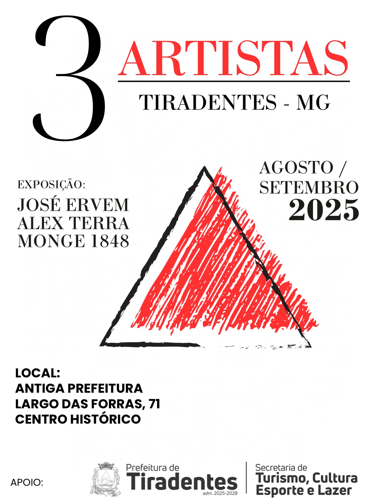 A exposição “3 artistas” será inaugurada no dia 22 de agosto de 2025, às 19h19, em Tiradentes (MG), com visitação aberta até o dia 30 de setembro, às 17h. O evento apresenta um conjunto de obras inéditas e marcantes das trajetórias de três artistas atuantes na região: @monge1848, @joseervem e @alexterrabichinho7.