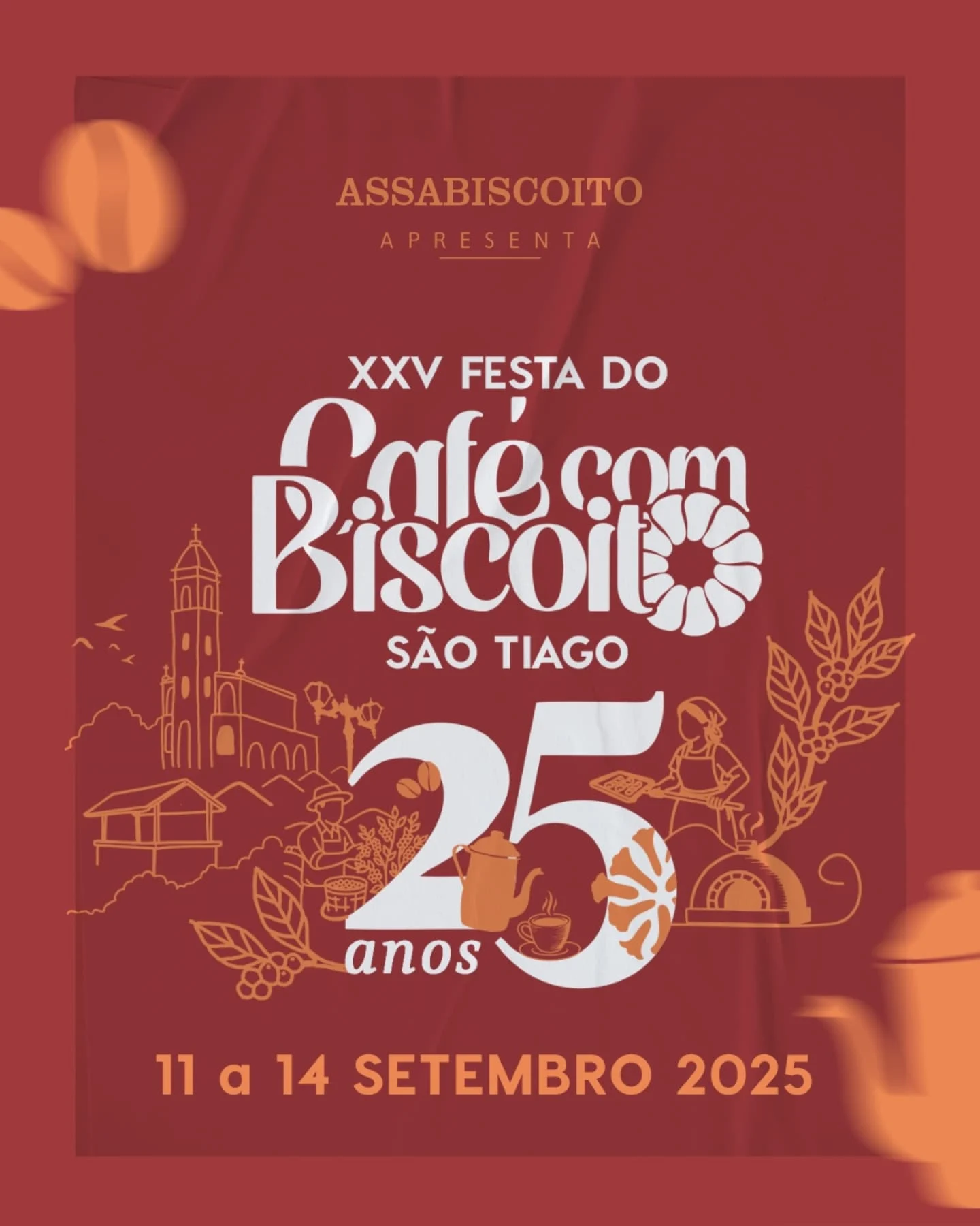 A Festa do Café com Biscoito 2025 acontece entre os dias 11 e 14 de setembro, na cidade de São Tiago (MG). O evento, considerado o maior festival da culinária mineira, celebra a tradição do café acompanhado das quitandas típicas da região. Os estandes de degustação funcionam de 12 a 14 de setembro, das 9h às 11h e das 13h às 17h, reunindo visitantes e moradores na Praça Central.