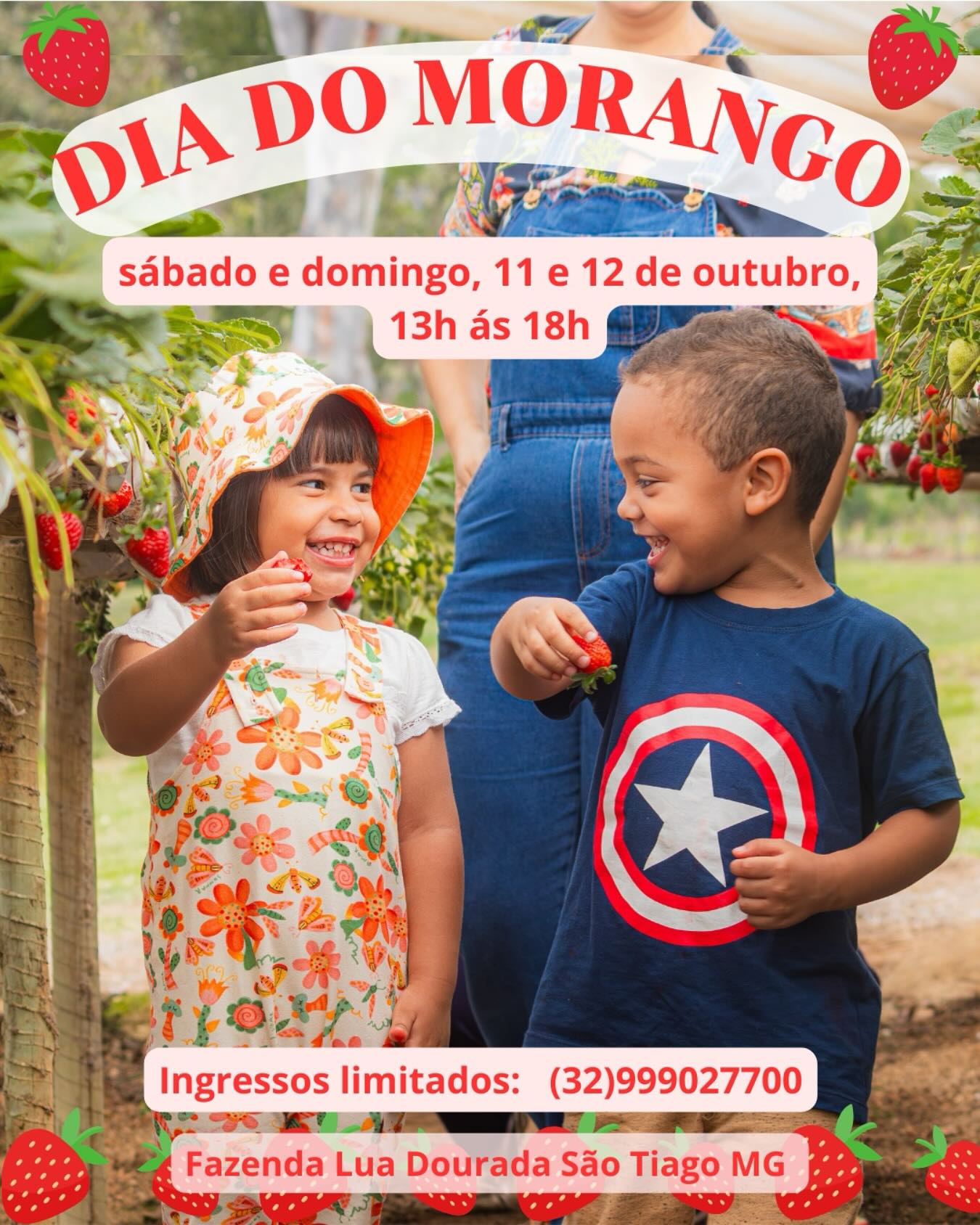 O Dia do Morango será realizado nos dias 11 e 12 de outubro de 2025, na Fazenda Lua Dourada, em São Tiago (MG). O evento promete reunir famílias e visitantes para um fim de semana de lazer no campo, em contato direto com a natureza e com a possibilidade de colher morangos frescos.