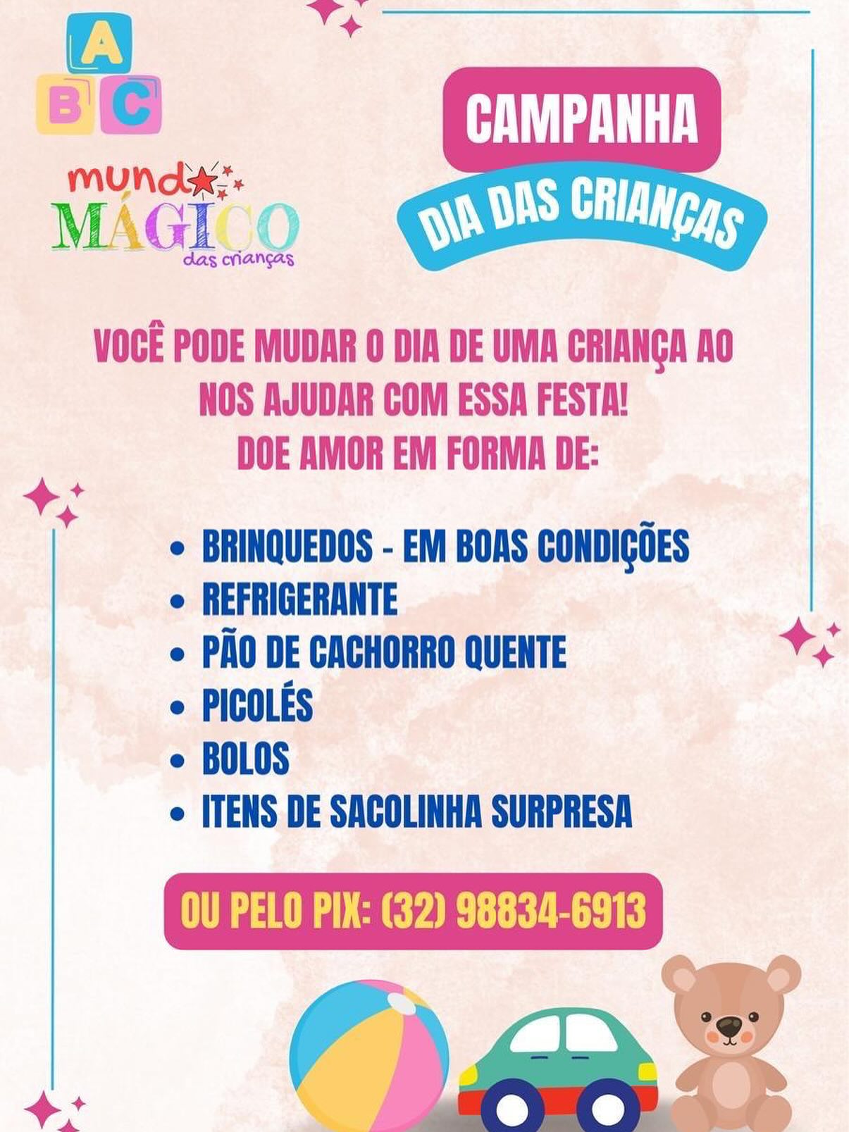 A tradicional campanha de dia das crianças de São João Del Rei agora tem um nome para chamar de seu: Mundo Mágico das crianças! A Família Resgalla realiza festas em comunidades para celebrar o dia das crianças. Participe, contribua!
