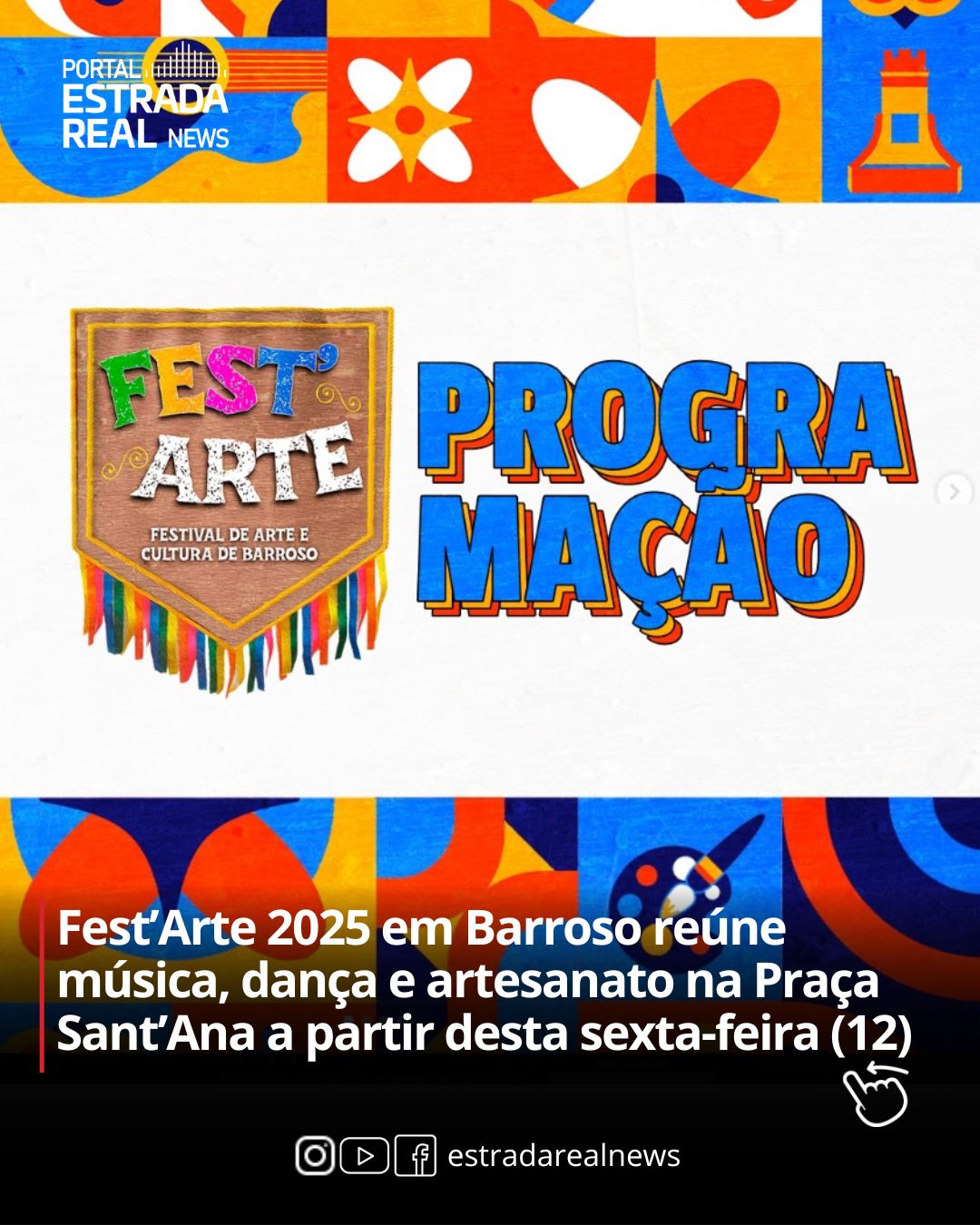 O Fest’Arte 2025 será realizado em Barroso (MG), entre os dias 12 e 14 de setembro, promovendo atividades culturais na Praça Sant’Ana. O evento reúne música, dança, capoeira, batalhas de rap, artesanato e o desfile da Rainha da Expo 2025, consolidando-se como um espaço de integração cultural e artística para a cidade.