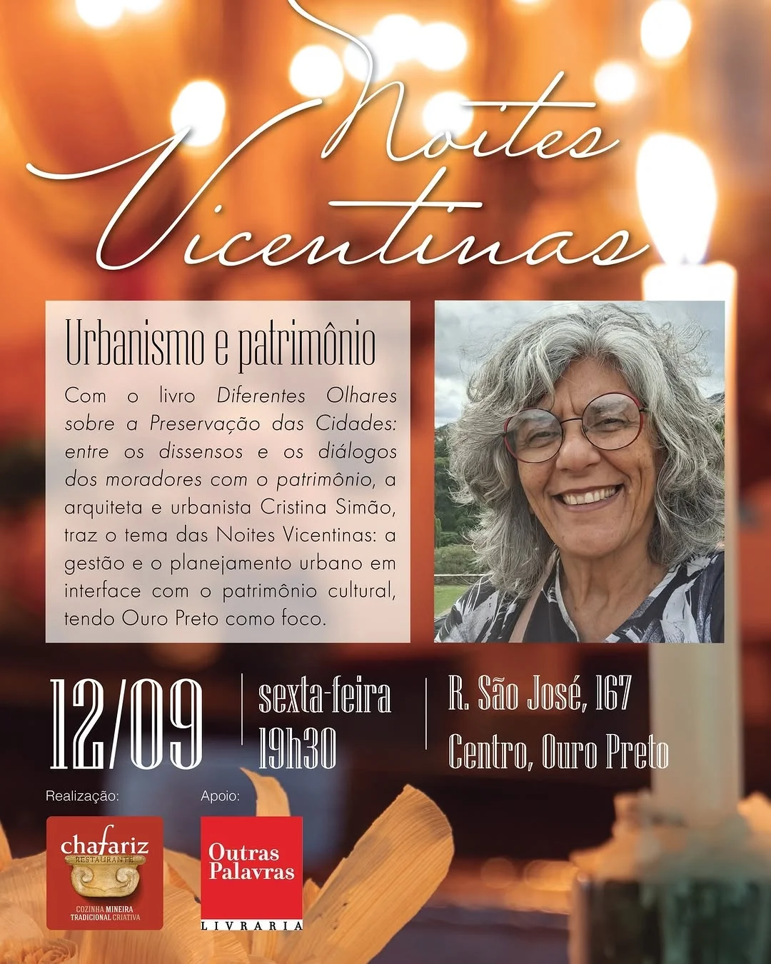 As Noites Vicentinas 2025 receberão a arquiteta e urbanista Cristina Simão para uma conversa sobre urbanismo e patrimônio cultural em Ouro Preto (MG). O evento será realizado no Chafariz, na sexta-feira, 12 de setembro, às 19h, como parte da programação cultural da cidade.
