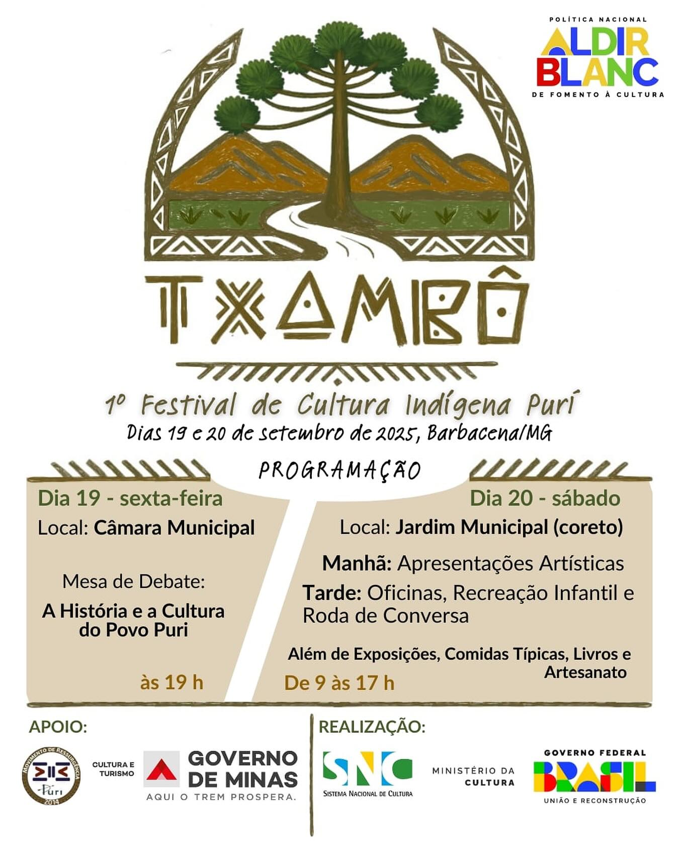 O I Festival Itinerante de Cultura Indígena Purí – TXAMBÔ será realizado nos dias 19 e 20 de setembro de 2025, na cidade de Barbacena, Minas Gerais. O festival propõe um reencontro com a ancestralidade do povo Purí, celebrando a juventude, a renovação da vida e o conhecimento tradicional. Na língua Purí, TXAMBÔ significa “encontro para contar a história da ancestralidade”, tradição que historicamente ocorria durante o Equinócio da Primavera. O evento busca promover a valorização da cultura indígena por meio de arte, história e saberes ancestrais.