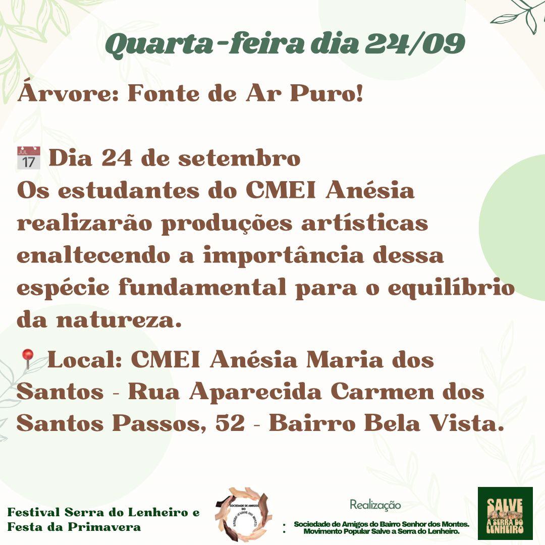 O Festival da Serra do Lenheiro e Festa da Primavera 2025 (confira a programação completa) segue em São João del-Rei (MG) na quarta-feira, 24 de setembro de 2025, com atividades educativas voltadas à conscientização ambiental. A programação ocorre no CMEI Anésia Maria dos Santos, localizado no bairro Bela Vista, envolvendo crianças e educadores em ações de valorização da natureza.