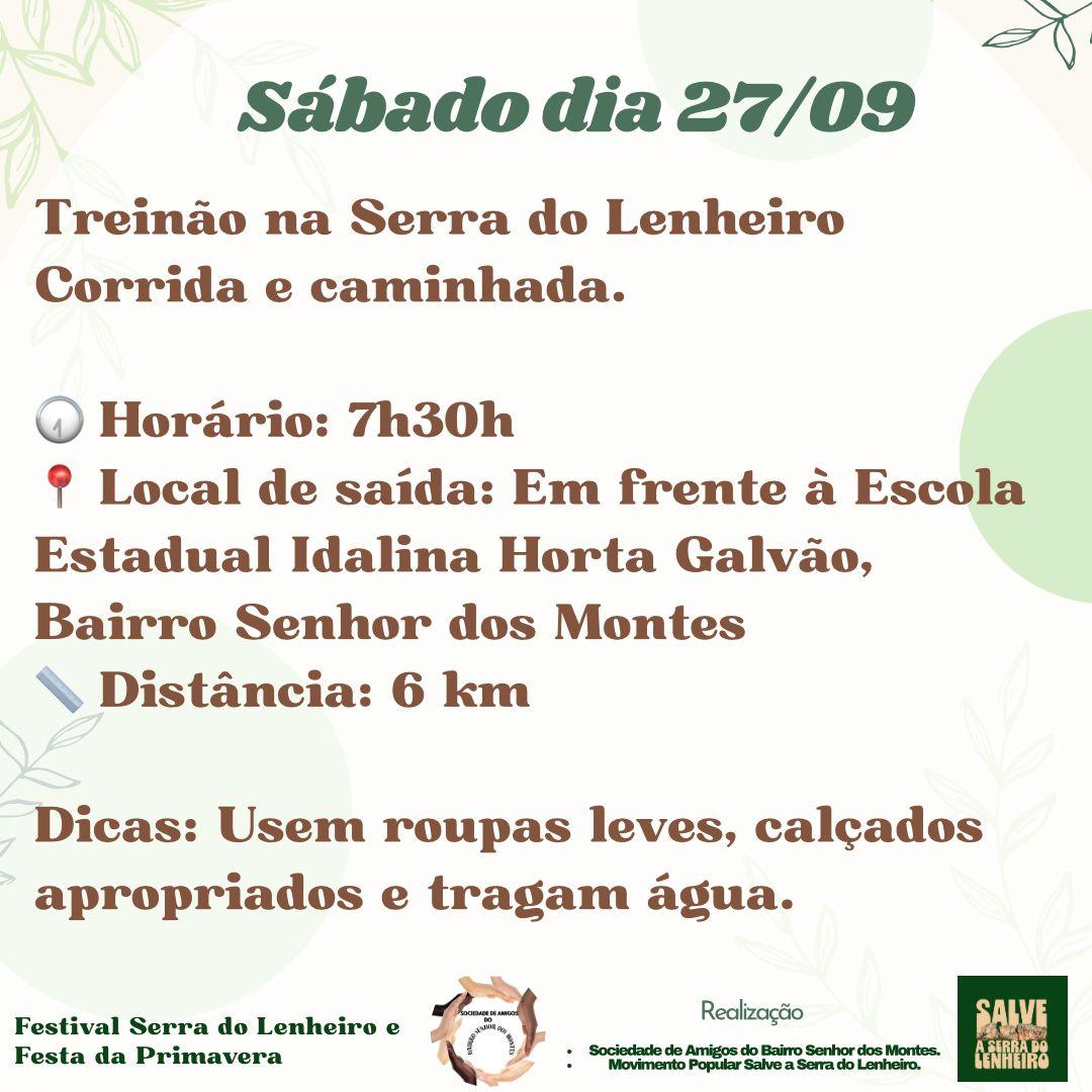 A programação começa às 7h30, com o Treinão na Serra do Lenheiro, corrida e caminhada de 6 km com saída em frente à Escola Estadual Idalina Horta Galvão, no Bairro Senhor dos Montes. A organização recomenda o uso de roupas leves, calçados adequados e a hidratação durante o percurso.