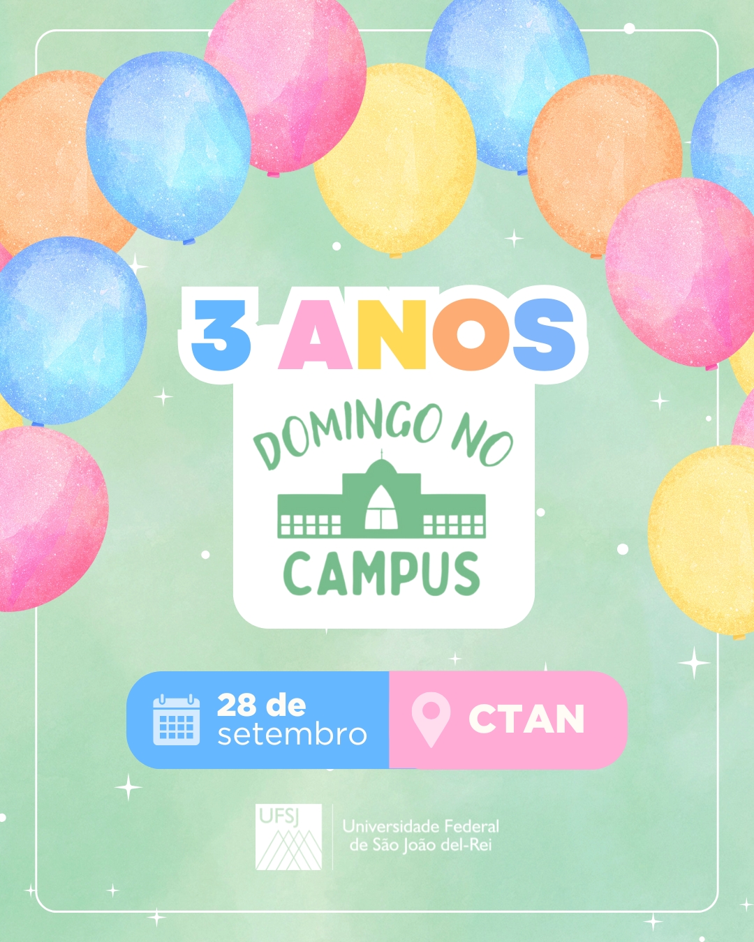 O Domingo no Campus celebra 3 anos de atividades com uma edição comemorativa no dia 28 de setembro de 2025, a partir das 9h, no Campus Tancredo Neves (CTAN) da UFSJ, em São João del-Rei (MG). Criado pelo programa de extensão Amigo de Bicho, o projeto promove encontros mensais abertos à comunidade, reunindo atividades culturais, esportivas e educativas em um espaço de lazer e convivência.
