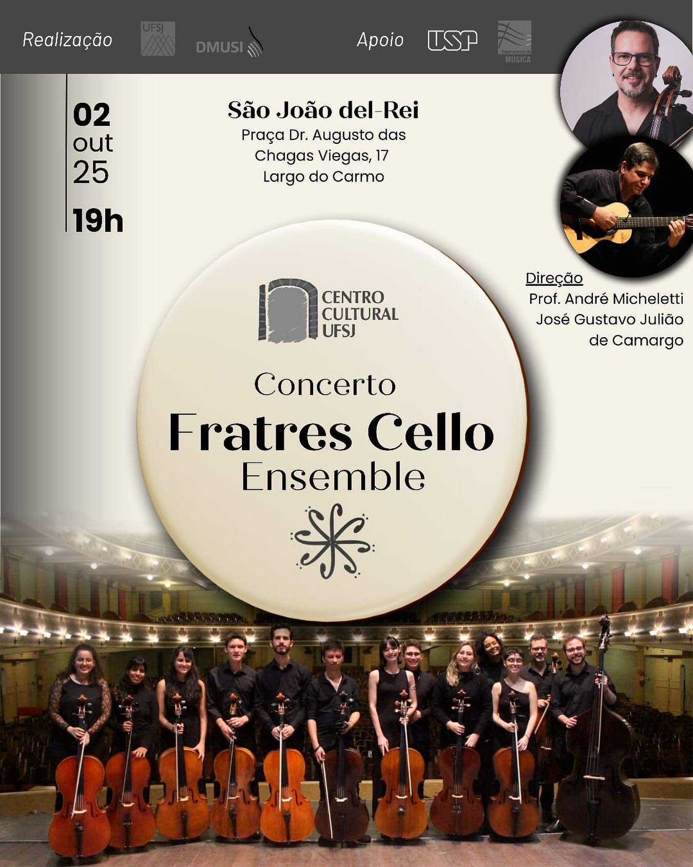O Centro Cultural da Universidade Federal de São João del-Rei (UFSJ) recebe no dia 2 de outubro de 2025, às 19h, o concerto do Fratres Cello Ensemble. A apresentação acontecerá na sede do Centro Cultural, localizada na Praça Dr. Augusto das Chagas Viegas, 17, Largo do Carmo, em São João del-Rei (MG).