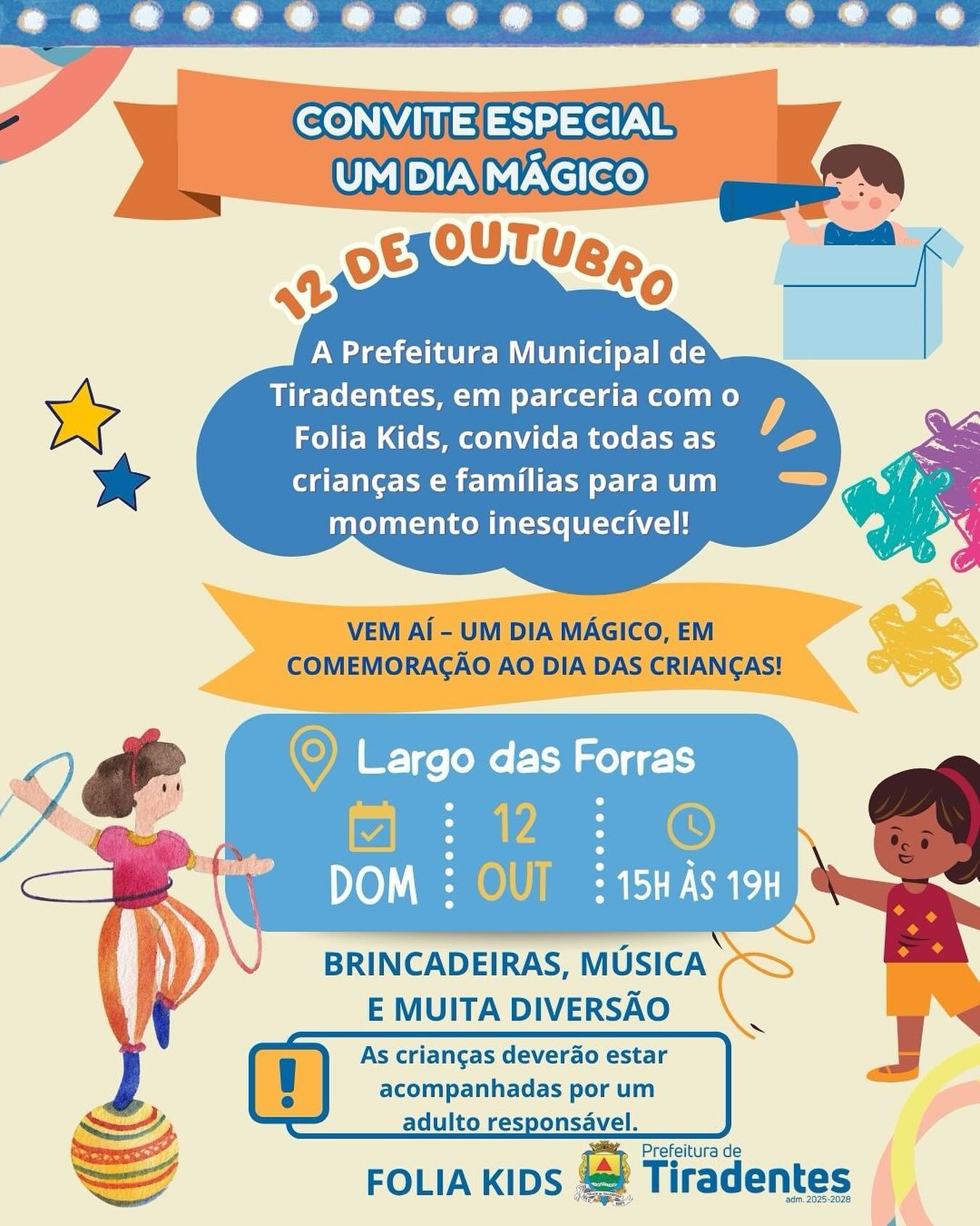 O evento Um Dia Mágico, promovido pela Prefeitura Municipal de Tiradentes em parceria com o Folia Kids, será realizado no dia 12 de outubro de 2025 (domingo), das 15h às 19h, no Largo das Forras, principal praça da cidade. A iniciativa celebra o Dia das Crianças com atividades voltadas ao lazer e à convivência familiar.