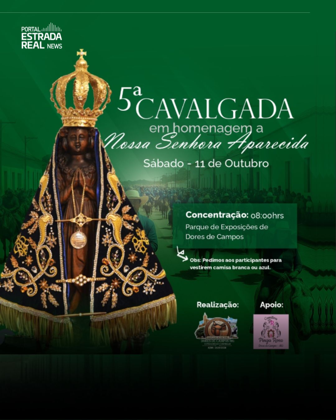 A 5ª Cavalgada em Homenagem a Nossa Senhora Aparecida será realizada no sábado, 11 de outubro de 2025, em Dores de Campos (MG). O evento é promovido pela Prefeitura Municipal de Dores de Campos e celebra a devoção à padroeira do Brasil, reunindo cavaleiros, amazonas e famílias em uma manifestação de fé e tradição popular.