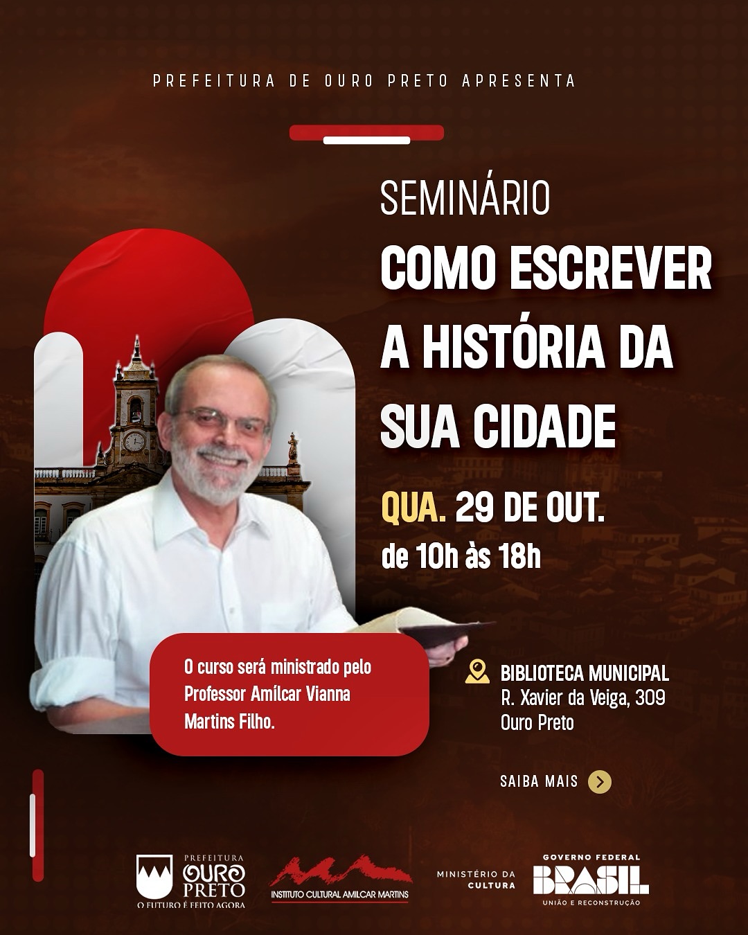 A Biblioteca Pública Municipal de Ouro Preto recebe, no dia 29 de outubro de 2025, o seminário “Como Escrever a História da Sua Cidade”, ministrado pelo professor Amílcar Vianna Martins Filho. O encontro ocorre das 10h às 18h e tem como objetivo apresentar métodos e práticas de pesquisa histórica local, estimulando a preservação das memórias e identidades das comunidades.