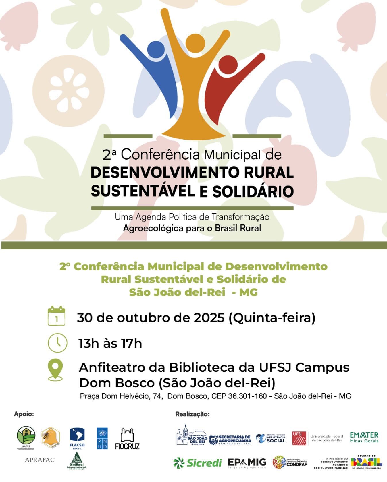 A 2ª Conferência Municipal de Desenvolvimento Rural Sustentável e Solidário será realizada no dia 30 de outubro de 2025, das 13h às 17h, no anfiteatro da Biblioteca da UFSJ – Campus Dom Bosco, em São João del-Rei (MG). O evento é promovido pela Prefeitura Municipal de São João del-Rei e tem como objetivo promover o diálogo, a troca de conhecimentos e a construção de propostas voltadas ao fortalecimento do desenvolvimento rural sustentável e solidário no município.