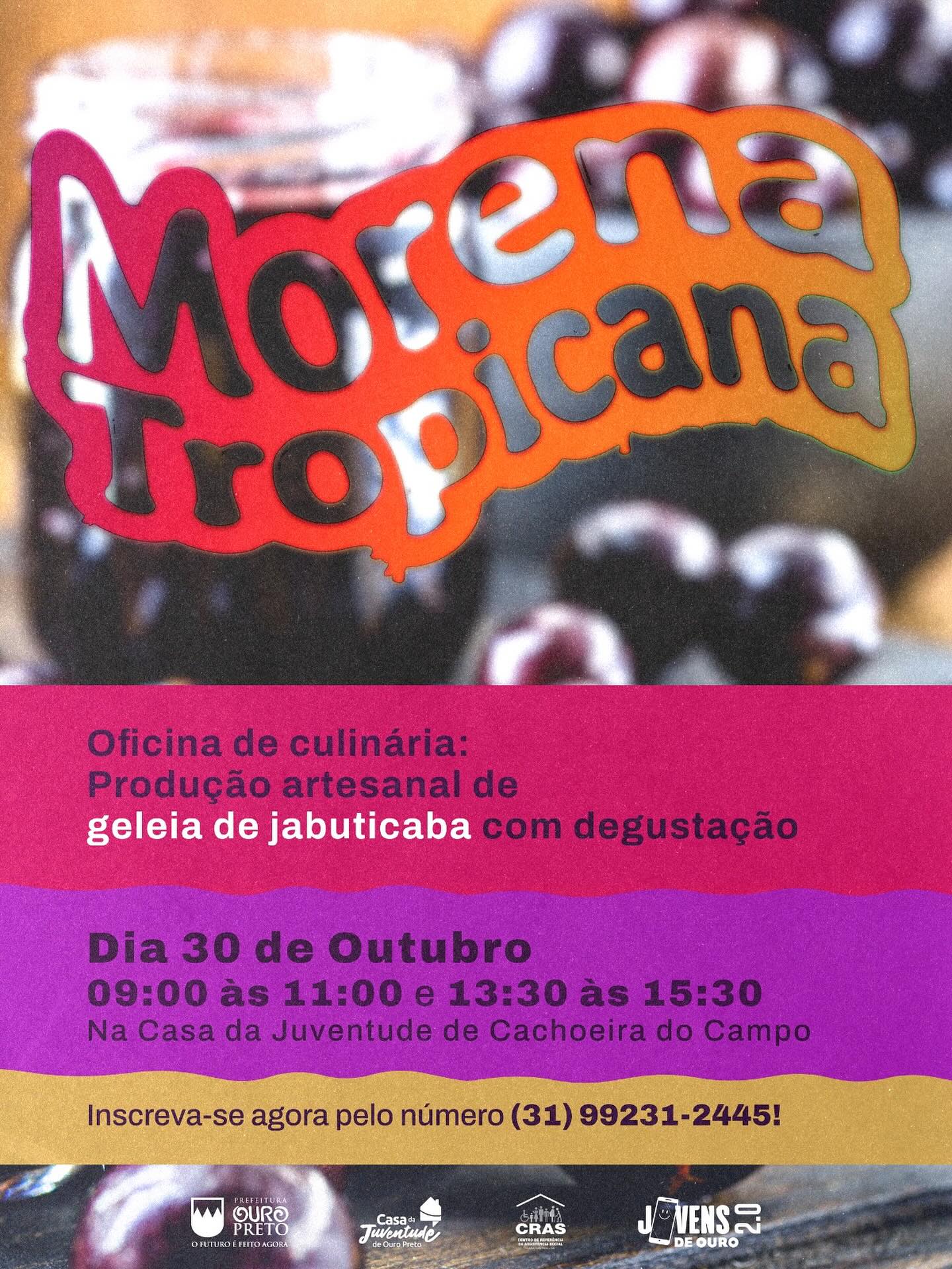 O projeto Morena Tropicana | Juventude Protagonista promove uma oficina de culinária artesanal voltada para jovens da comunidade de Cachoeira do Campo, distrito de Ouro Preto (MG). A atividade, realizada pela Casa da Juventude de Cachoeira do Campo, acontece no dia 30 de outubro de 2025, na Praça Felipe dos Santos, e tem como foco o aprendizado prático da produção artesanal de geleia de jabuticaba, com direito a degustação.