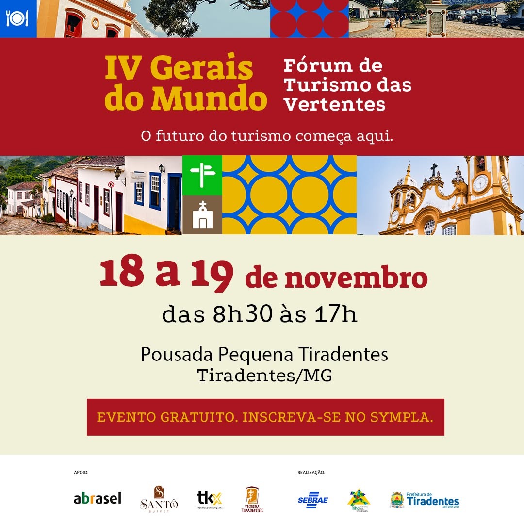 A cidade de Tiradentes (MG) sediará a IV edição do Fórum Gerais do Mundo – Turismo das Vertentes, nos dias 18 e 19 de novembro de 2025, na Pousada Pequena Tiradentes, das 8h30 às 17h. O evento é uma iniciativa do Sebrae Minas e tem como objetivo promover debates e reflexões sobre o futuro do turismo na região, com entrada gratuita e inscrições abertas pelo Sympla.