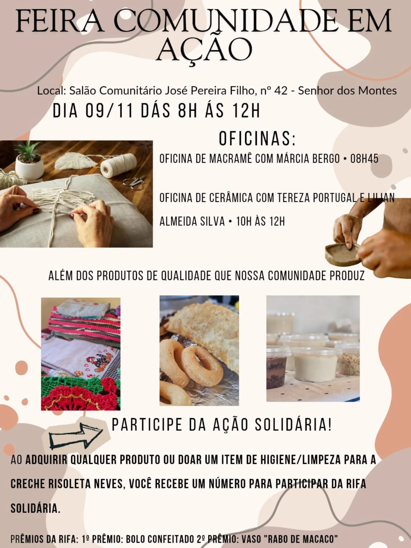 A Feira Comunidade em Ação será realizada no dia 9 de novembro de 2025, das 8h às 12h, no Salão Comunitário José Pereira Filho, localizado no número 42 do bairro Senhor dos Montes, em São João del-Rei (MG). O evento tem como objetivo fortalecer o vínculo comunitário, valorizar a produção local e incentivar práticas solidárias entre os moradores.