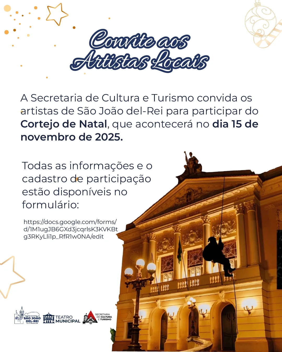 A Secretaria de Cultura e Turismo de São João del-Rei divulgou um convite aos artistas locais para participarem do Cortejo de Natal 2025, que será realizado no dia 15 de novembro de 2025. O evento faz parte das celebrações natalinas da cidade e tem como objetivo promover a integração da comunidade artística e celebrar a tradição cultural local.
