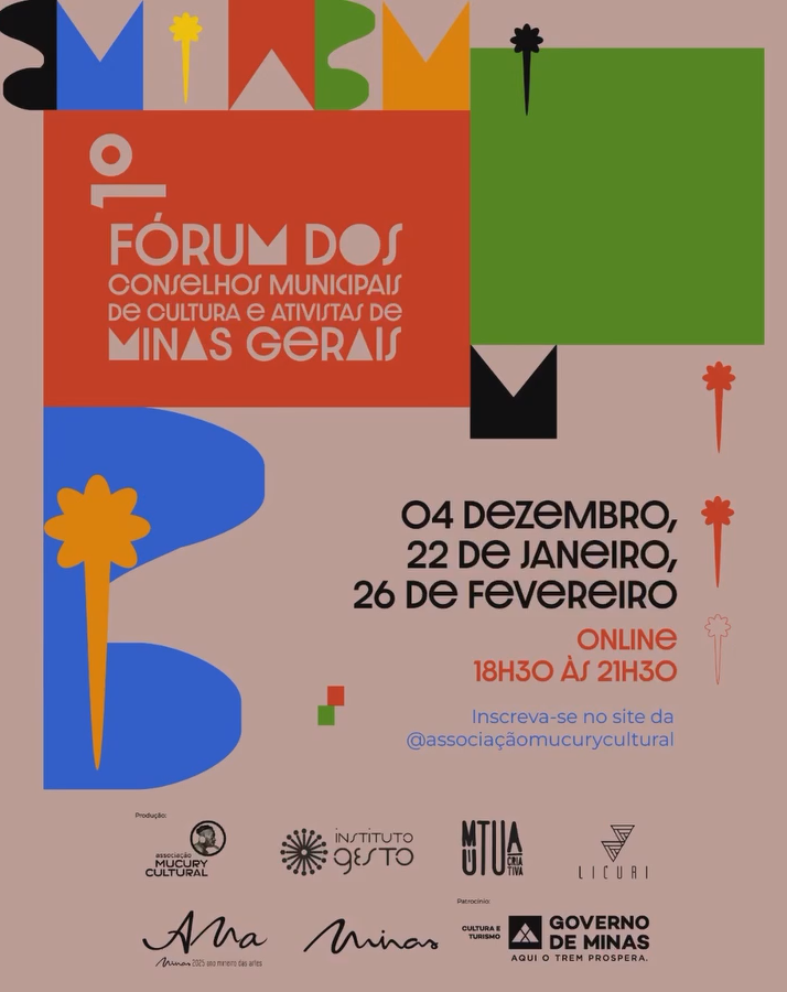 As inscrições gratuitas podem ser feitas pelo site www.mucurycultural.org/forumconselhoculturamg ou pelo link na bio do perfil @associacaomucurycultural.