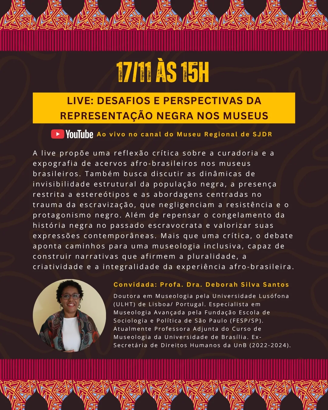 A convidada da live é a Profa. Dra. Deborah Silva Santos, doutora em Museologia pela Universidade Lusófona (ULHT), especialista em Museologia Avançada pela FESP/SP e professora adjunta da Universidade de Brasília. Deborah também atuou como secretária de Direitos Humanos da UnB (2022–2024) e desenvolve pesquisas sobre curadoria crítica, patrimônio afro-brasileiro e políticas de representação.