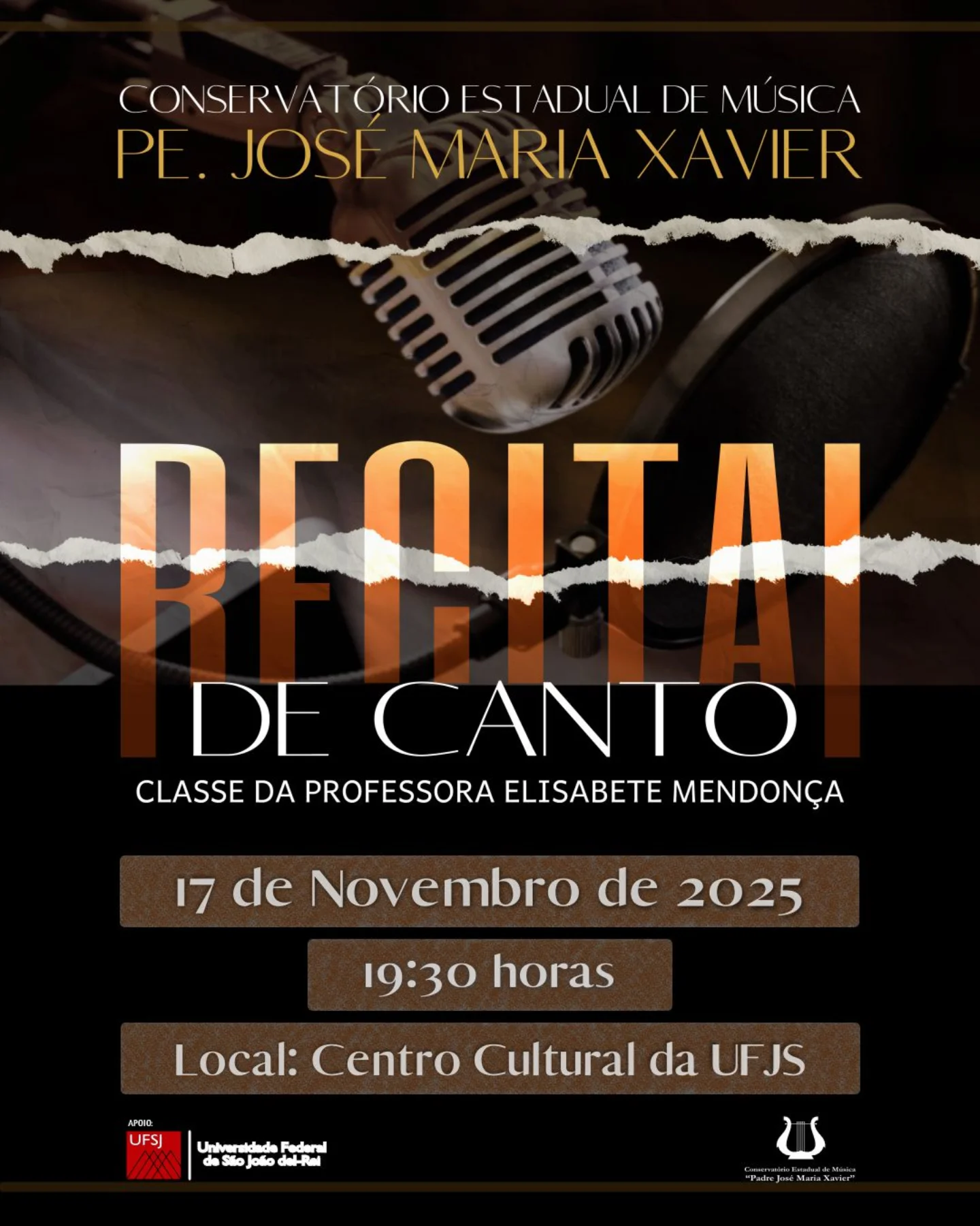O Recital de Canto do Conservatório Estadual de Música Padre José Maria Xavier, realizada pela classe da professora Elisabete Mendonça, acontecerá no dia 17 de novembro de 2025, às 19h30, no Centro Cultural da UFSJ, em São João del-Rei. O evento é aberto ao público e integra as ações formativas da instituição.
