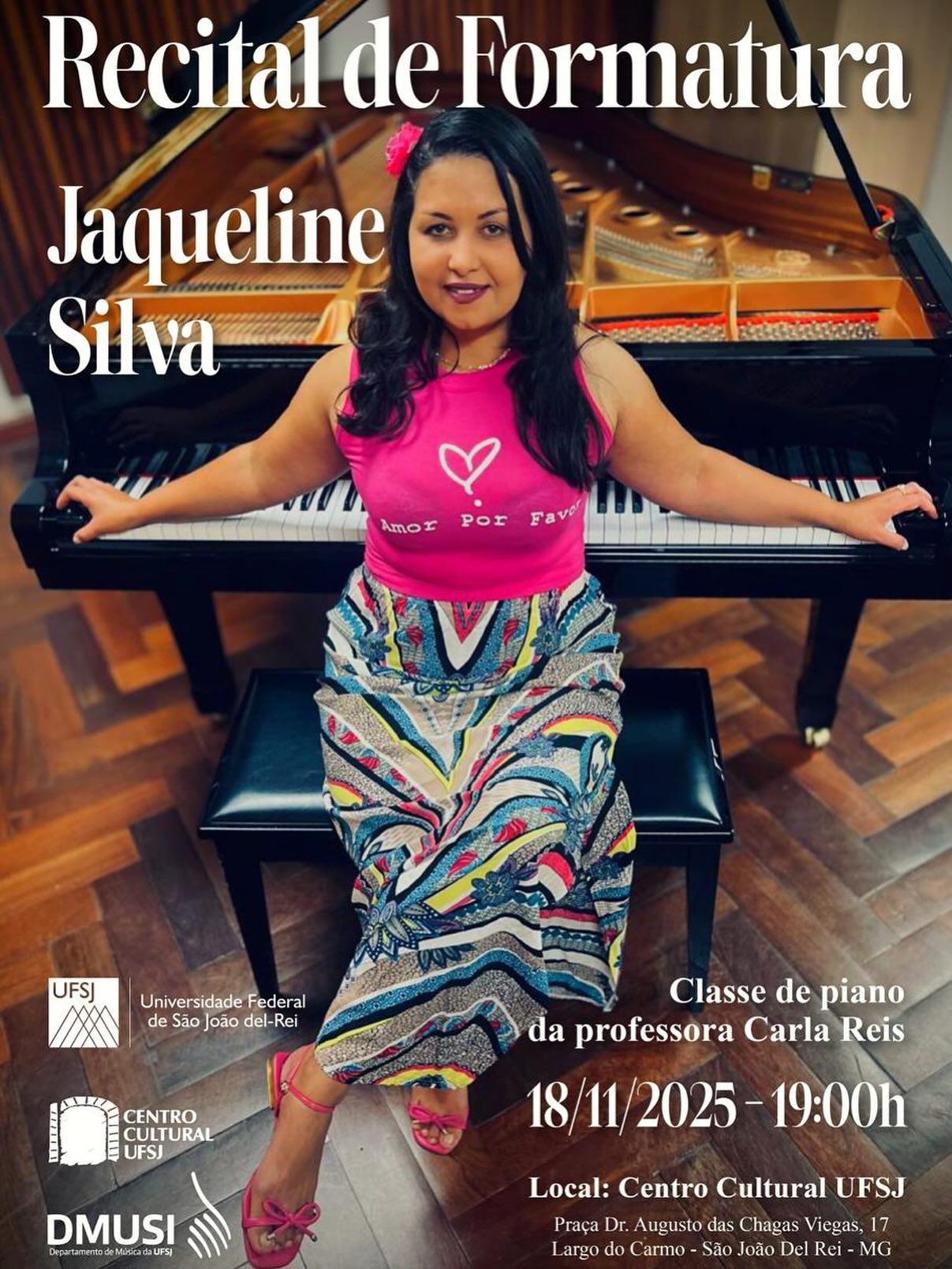 O Recital de Formatura de Jaqueline Silva será realizado em 18 de novembro de 2025, às 19h, no Centro Cultural da UFSJ, em São João del-Rei. O evento integra as atividades do Departamento de Música da Universidade Federal de São João del-Rei (UFSJ) e destaca o trabalho desenvolvido na classe de piano da professora Carla Reis.