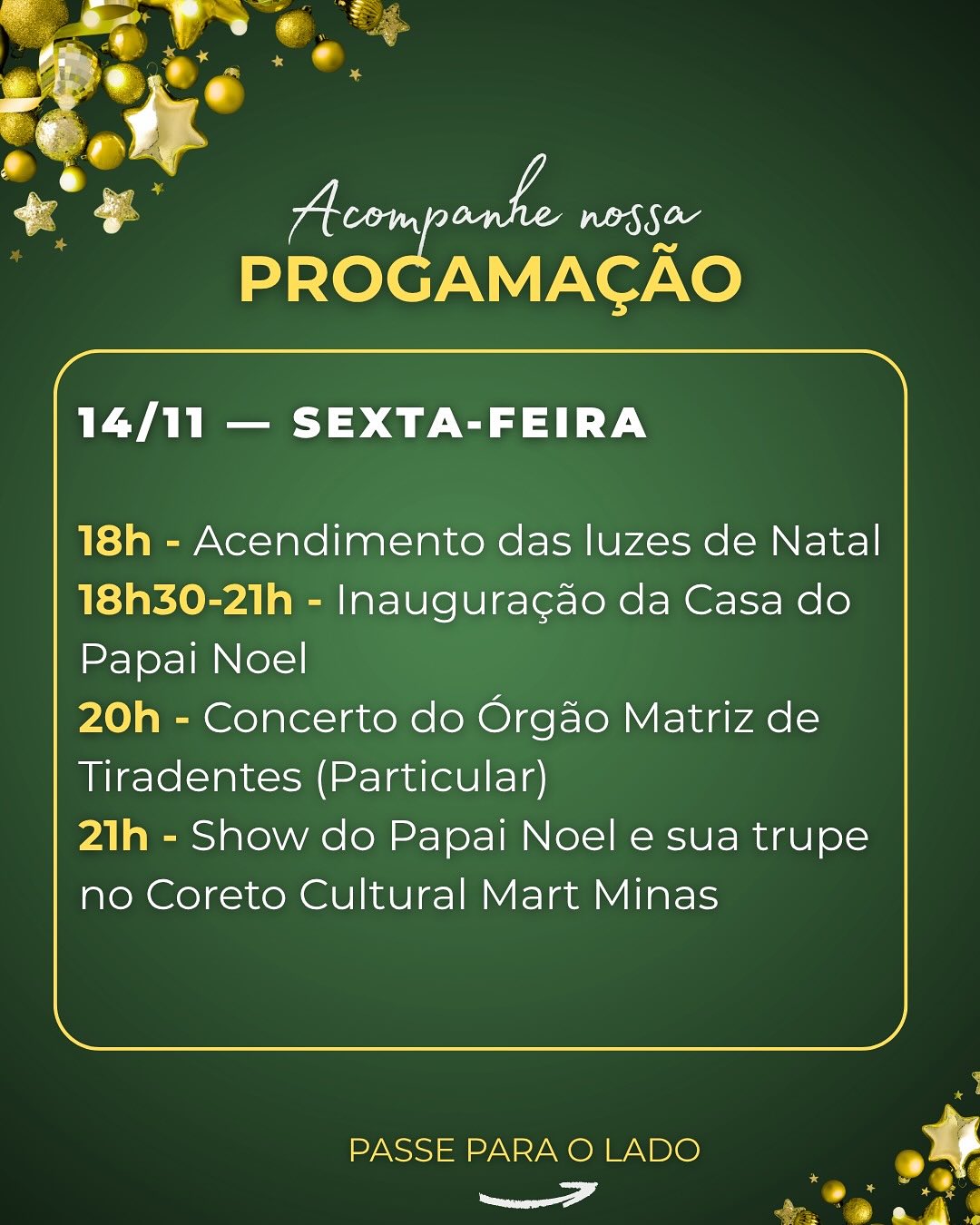 O Natal Tiradentes 2025 inicia sua programação na sexta-feira, 14 de novembro, com atividades abertas ao público em diversos pontos da cidade histórica de Tiradentes (MG). As ações começam a partir das 18h, marcando o início das celebrações natalinas que movimentam moradores e visitantes todos os anos.