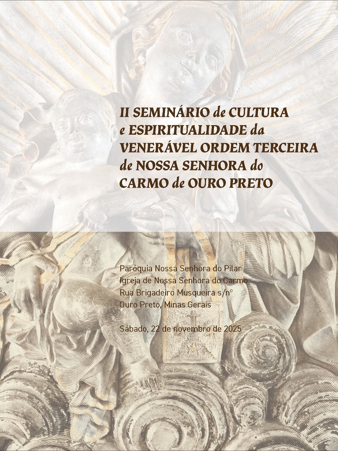 O II Seminário de Cultura e Espiritualidade da Venerável Ordem Terceira de Nossa Senhora do Carmo de Ouro Preto será realizado no dia 22 de novembro, em Ouro Preto, reunindo pesquisadores, especialistas, autoridades religiosas e membros da comunidade. O encontro propõe um dia de debates sobre patrimônio, história, arte sacra e espiritualidade, fortalecendo o diálogo entre fé, cultura e preservação.