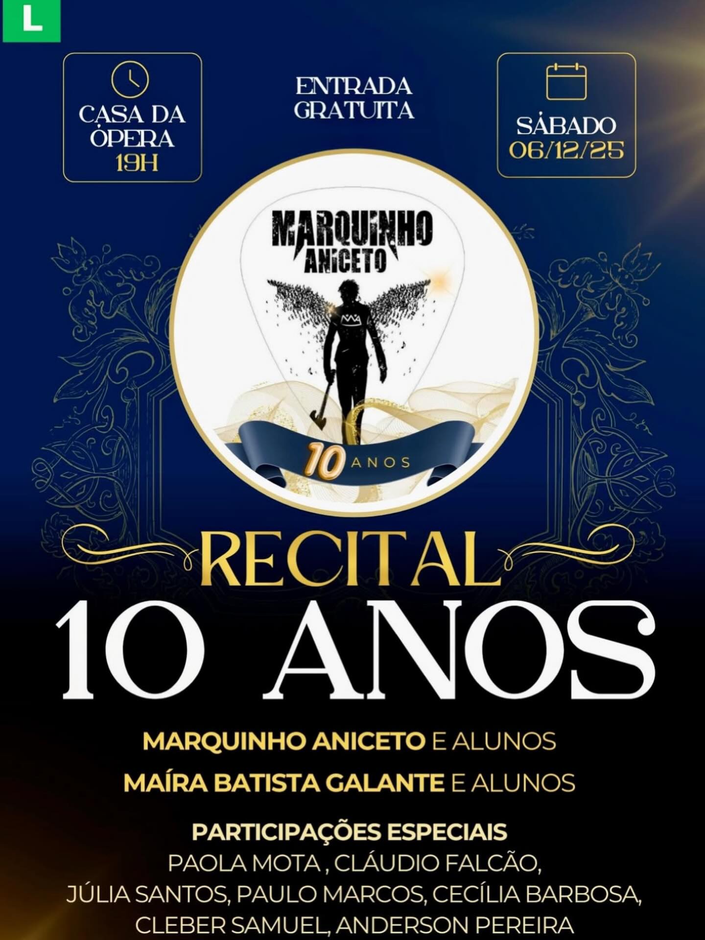 O Recital 10 Anos – Marquinho Aniceto será realizado no dia 6 de dezembro de 2025, às 19h, na Casa da Ópera, em Ouro Preto. O evento terá entrada gratuita, com acesso por ordem de chegada, e marca a celebração de uma década de trajetória artística do músico Marquinho Aniceto. A apresentação integra a programação cultural da cidade e destaca a formação de novos talentos por meio do trabalho do artista e seus colaboradores.