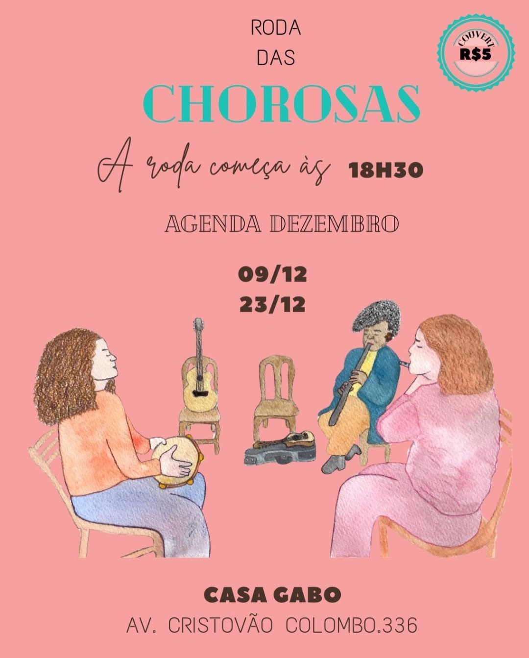 A Roda das Chorosas terá sua última edição do ano no dia 23 de dezembro de 2025, com início às 18h30, na Casa Gabo, situada na Avenida Cristóvão Colombo, 336, em Belo Horizonte (MG). Esta edição é apresentada como o encerramento oficial da agenda do projeto em 2025.