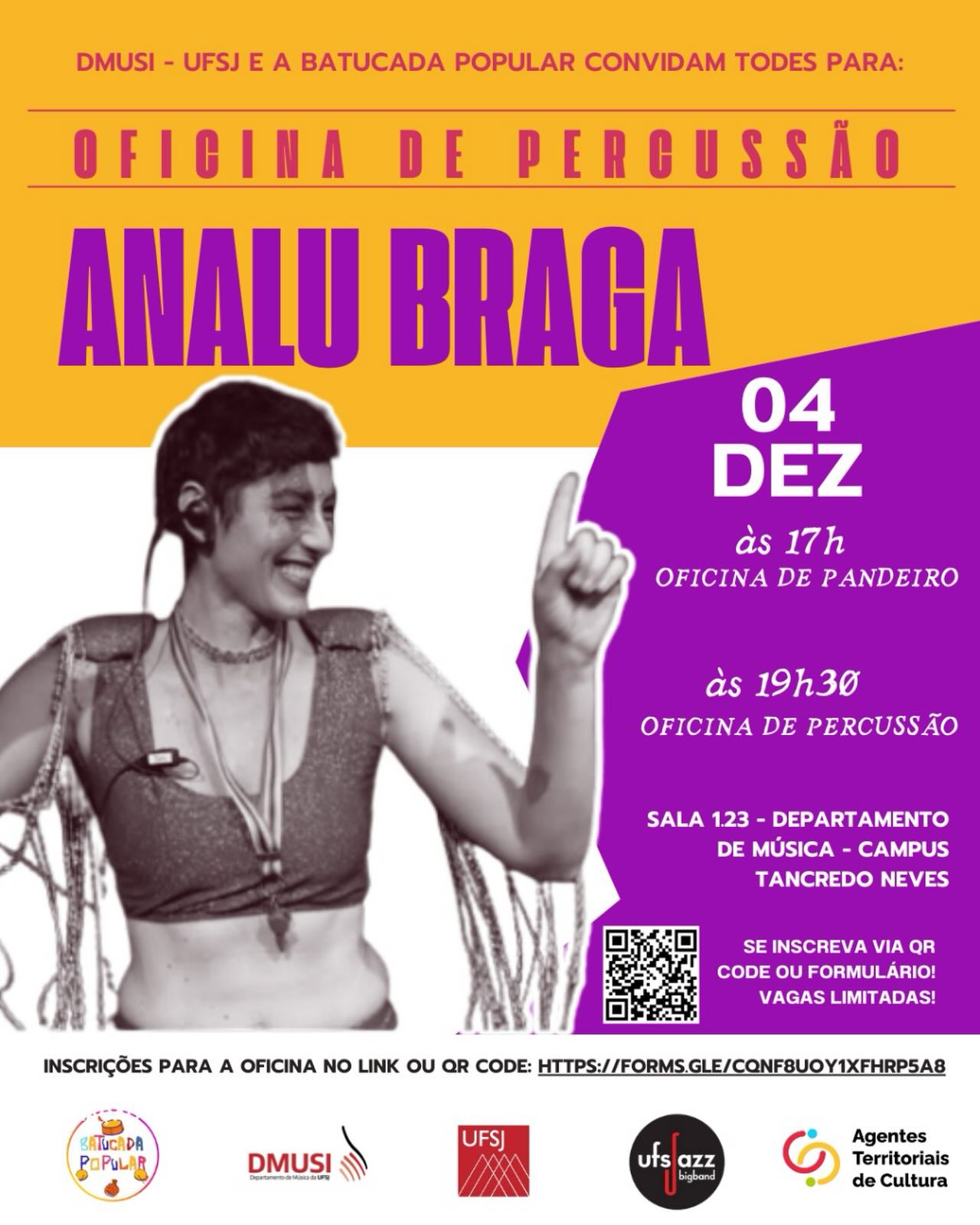A Oficina de Pandeiro e Percussão com Analu Braga será realizada no dia 04 de dezembro, no DMUSI – Universidade Federal de São João del-Rei (UFSJ), em São João del-Rei (MG). A atividade é promovida pelo DMUSI em parceria com a Batucada Popular, com foco na formação musical e no fortalecimento de práticas percussivas na região.